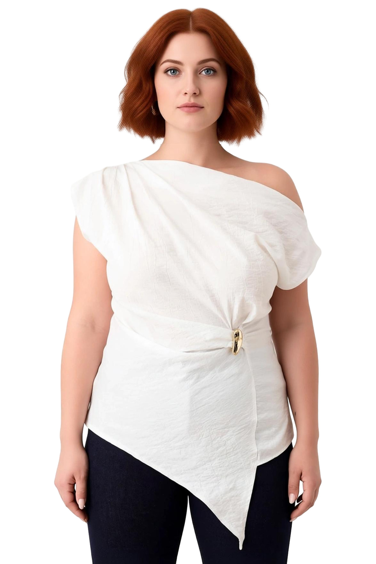 Bu özel tasarım bluz, büyük beden kadınlar için hem konforlu hem de şık bir seçenek sunar. Fitted kalıbı, vücut hatlarını nazikçe vurgulayarak zarif bir silüet oluşturur. Kayık yaka detayı, omuzları açıkta bırakarak feminen bir hava katarken, asimetrik kesimi modern bir estetik sunar. Üzerindeki zarif aksesuar detayı, bluzun genel görünümüne sofistike bir dokunuş ekler ve sıradanlıktan uzaklaştırır. Dokuma kumaş yapısı, ürüne hoş bir doku ve derinlik kazandırır, bu da görsel olarak çekici bir görünüm sağlar. Kolsuz tasarımı, hareket özgürlüğü sunar ve özellikle sıcak günlerde veya farklı giyim katmanları oluştururken tercih edilebilir. Düz deseni, aksesuarın ve kesimin ön plana çıkmasına olanak tanır, böylece şık ve zarif bir görünüm elde edilir. Bu bluz, günlük kullanım için idealdir ve farklı pantolon, etek veya şort modelleriyle kolayca kombinlenebilir. %100 polyester materyal bileşeni, ürünün dayanıklılığını ve kolay bakımını garanti eder. Kış sezonu için tasarlanmış olup, Türkiye’de üretilmiştir. Bu bluz, hem rahatlığı hem de stil sahibi olmayı önemseyen kadınlar için harika bir tercihtir. Günlük şıklığınızı bir üst seviyeye taşımak veya özel bir davette dikkat çekmek istediğinizde bu bluz size eşlik edecektir. Farklı takılar ve aksesuarlarla zenginleştirilerek kişisel tarzınızı en iyi şekilde yansıtmanızı sağlar.