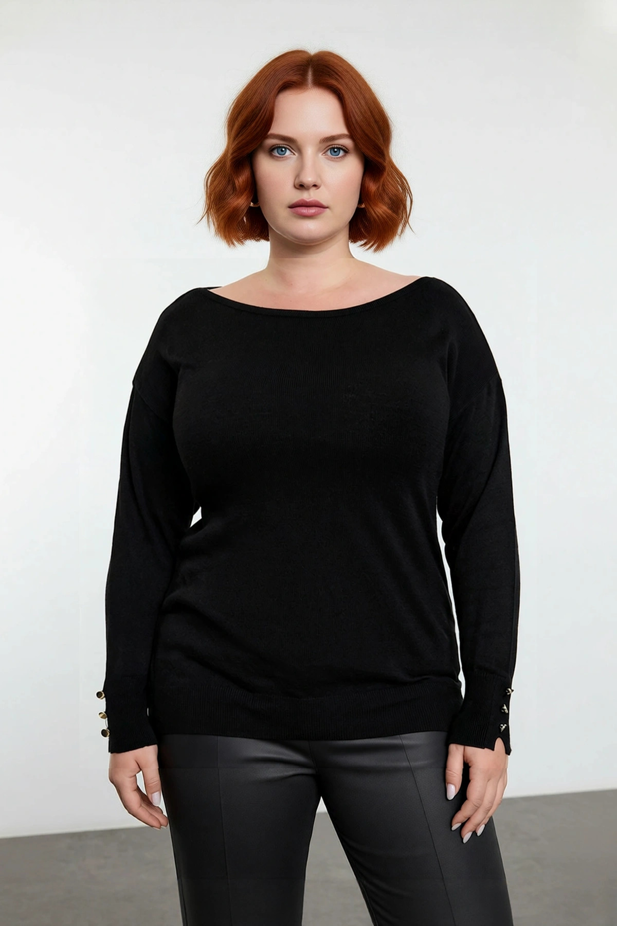 Ürün Özellikleri: Regular kalıp, 100% akrilik materyal, düz desen, kayık yaka, standart kol, triko kumaş, siyah renk, baskısız tasarım, büyük beden koleksiyon.