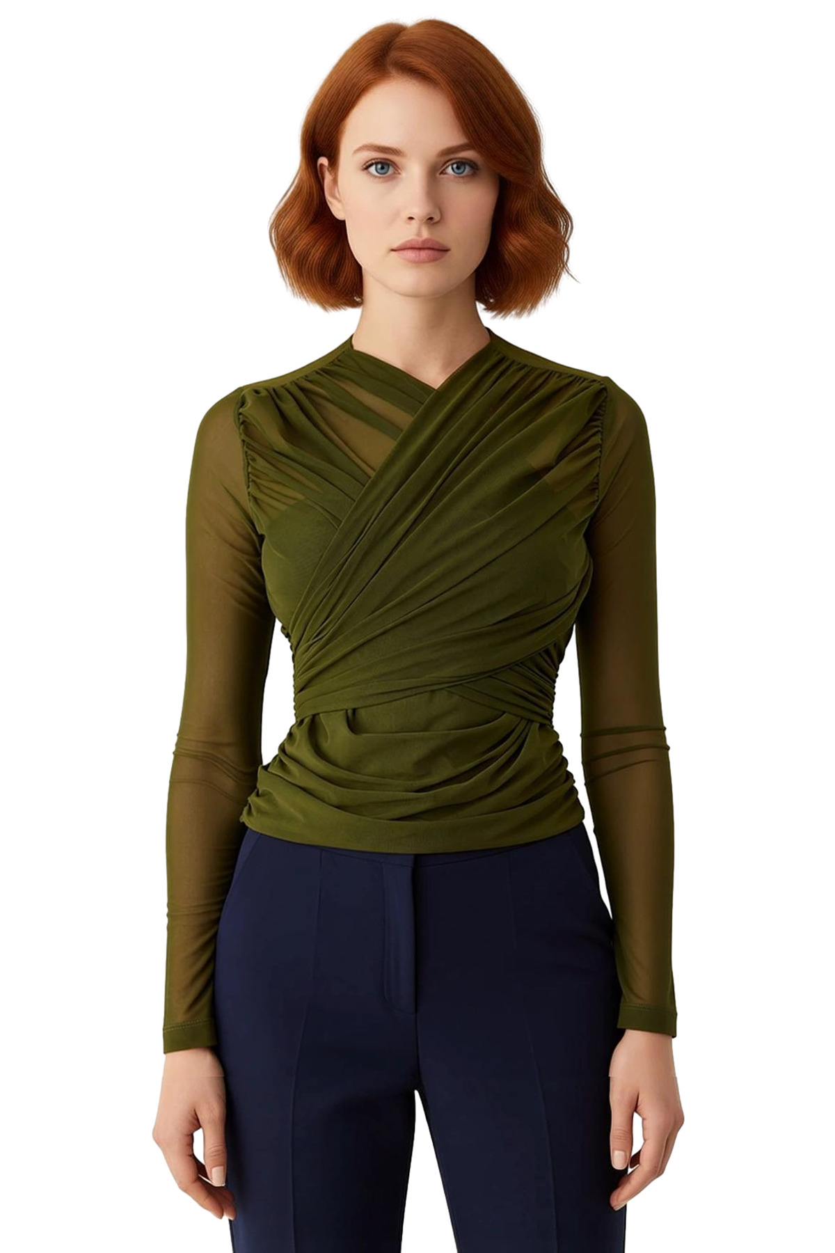 Görsel olarak çarpıcı ve stil sahibi bir parça olan bu bluz, kadınların özel anlarında fark yaratmasını sağlayacak şekilde tasarlanmıştır. Şeffaf tül kumaşı, zarif bir görünüm sunarken, üzerine işlenmiş büzgü detayları ürüne sofistike bir estetik kazandırır. Kruvaze yaka kesimi, klasik bir şıklığı modern bir yorumla birleştirerek, boyun ve omuz bölgesini zarifçe çerçeveler. Fitted kalıbı sayesinde vücuda kusursuz bir uyum sağlayarak, kullanıcının formunu en iyi şekilde sergiler. Uzun kollu yapısı, hem serin havalarda koruma sağlar hem de genel tasarıma zarif bir denge katar. Örme kumaş teknolojisi, giysinin hareket özgürlüğünü artırır ve gün boyu süren bir konfor sunar. %95 polyester ve %5 elastan karışımı, kumaşın hem dayanıklı olmasını hem de vücut hareketlerine uyum sağlamasını garanti eder. Bu bluz, özellikle parti ortamları ve özel etkinlikler için mükemmel bir seçimdir. Düz deseni, üzerindeki karmaşık büzgülerin ve kruvaze yakanın ön plana çıkmasına olanak tanır. Moda trendlerini yakından takip eden ve stilini cesurca ifade eden kadınlar için idealdir. Kış mevsimi için tasarlanmış olsa da, çok yönlü yapısı sayesinde farklı kombinlerle yılın her döneminde kullanılabilir. Ürünün uzun ömürlü olması için belirtilen yıkama talimatlarına (Hassas Yıkama) dikkat edilmesi önemlidir. Bu ürün, Türkiye’de özenle üretilmiştir.