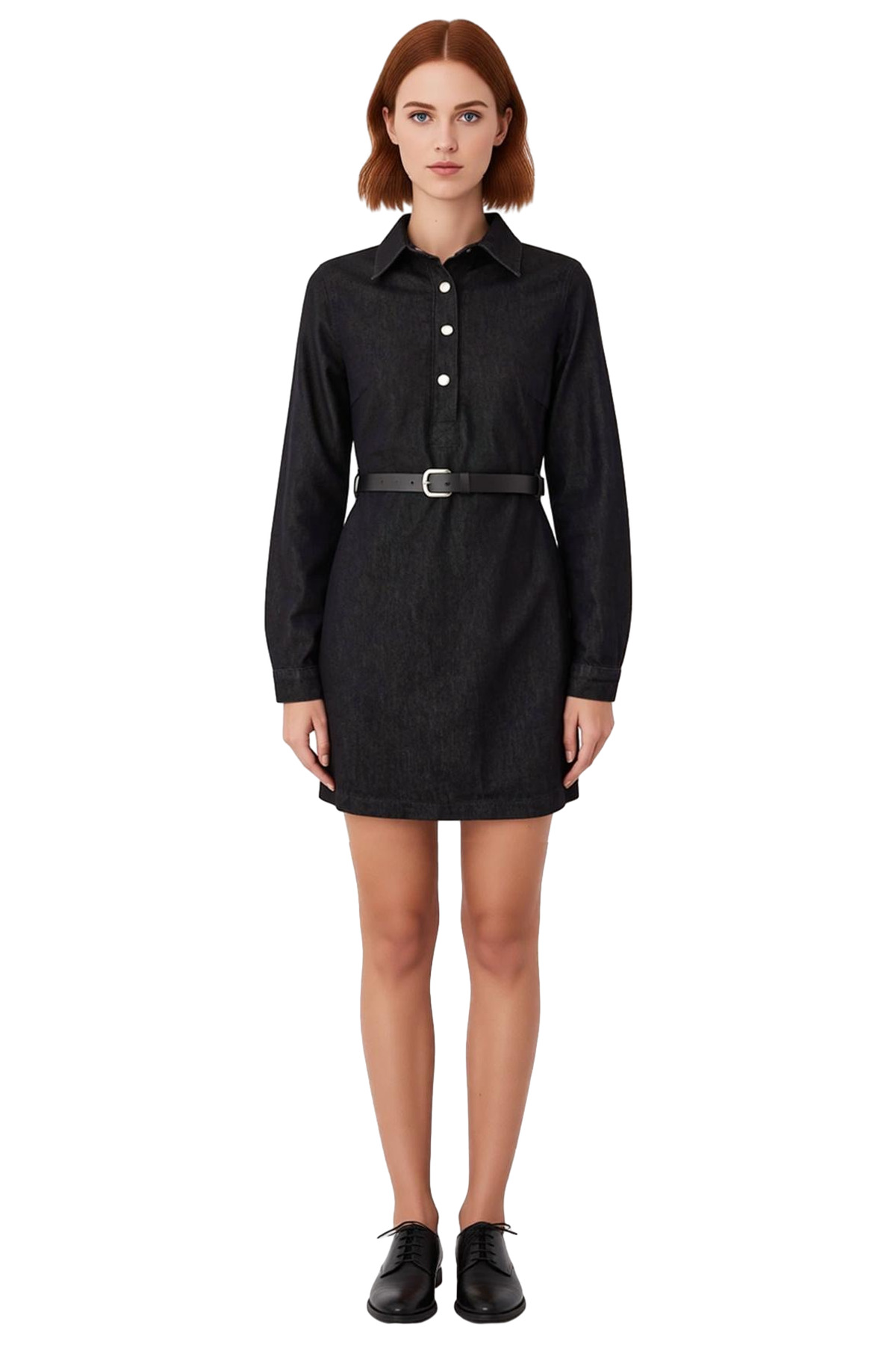 Ürün Özellikleri: A-line kalıp, %100 pamuk materyal, düz desen, gömlek yaka, standart kol, denim kumaş, siyah renk, astarsız tasarım, mini boy.