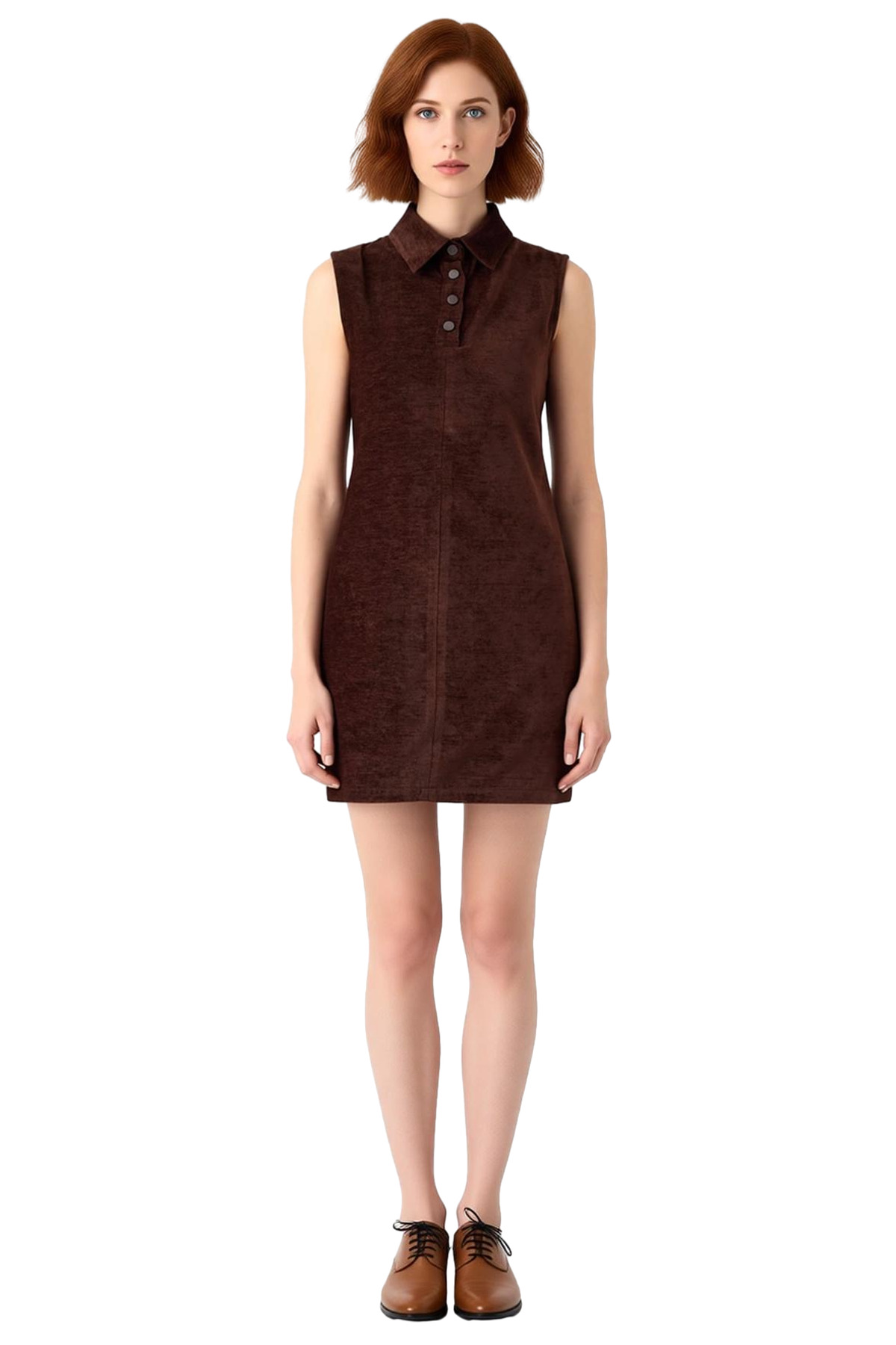 Ürün Özellikleri: A-line kalıp, 100% polyester materyal, düz desen, gömlek yaka, kolsuz kol, dokuma kumaş, kahverengi renk.
