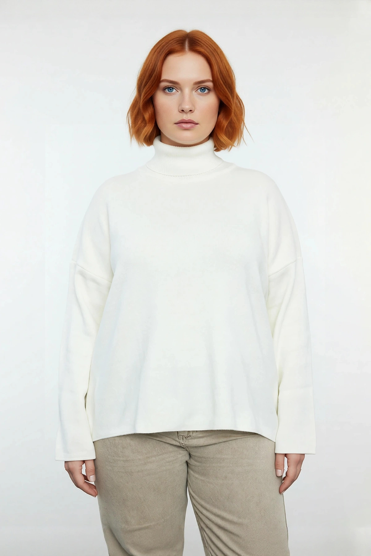 Ürün Özellikleri: Relaxed kalıp, %100 akrilik materyal, düz desen, balıkçı yaka, düşük kol, triko kumaş, ekru renk, cepsiz tasarım.
