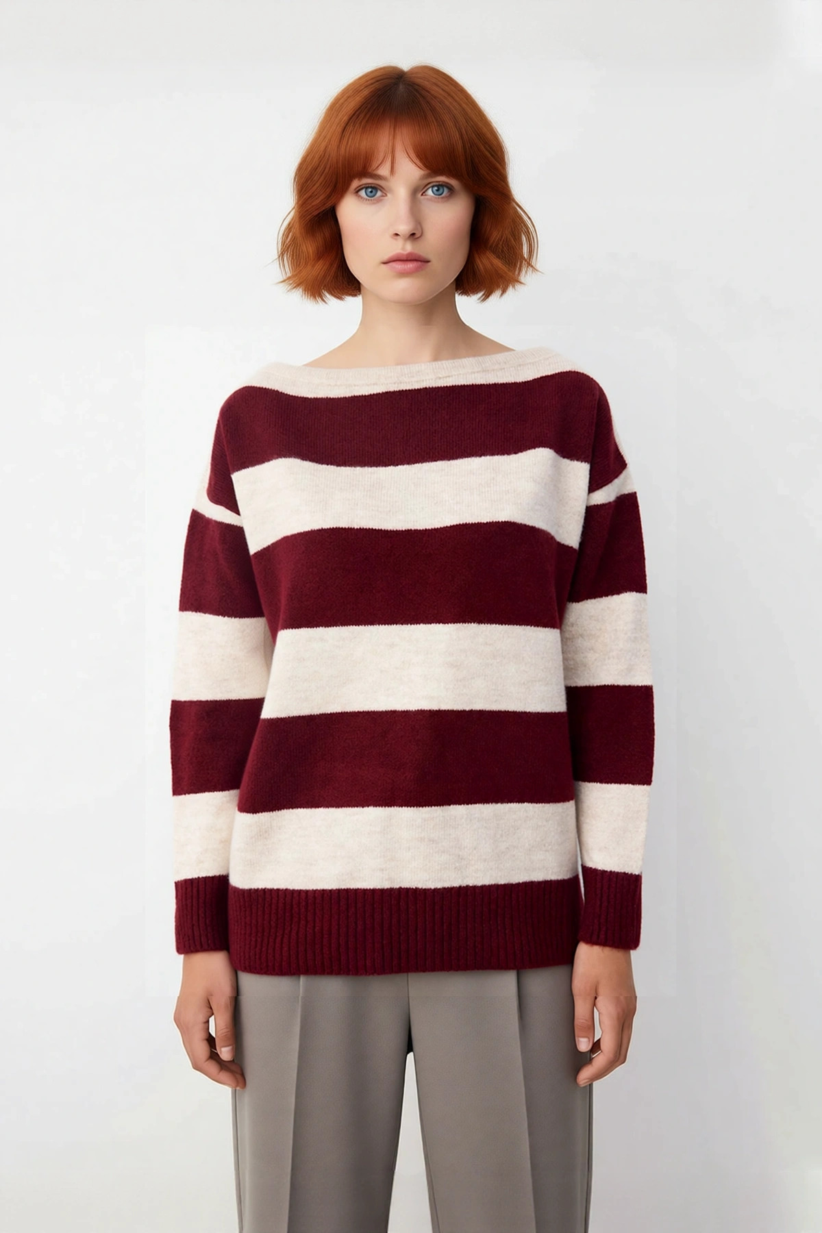 Ürün Özellikleri: Oversize kalıp, akrilik polyester karışım materyal, renk bloklu çizgili desen, kayık yaka, standart kol, triko kumaş, ekru bordo renk.