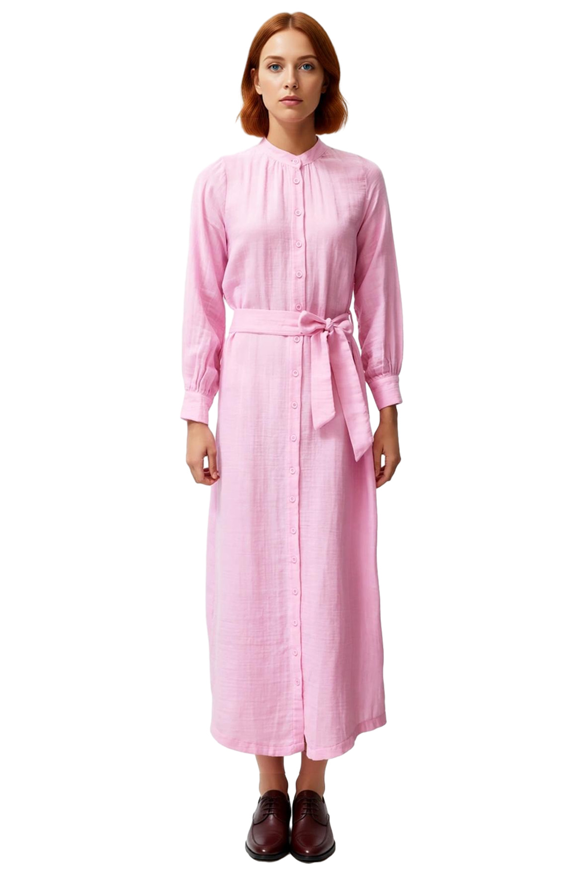 Ürün Özellikleri: Shift kalıp, %100 pamuk materyal, düz desen, hakim yaka, standart kol, dokuma kumaş, pembe renk, kuşaklı tasarım.