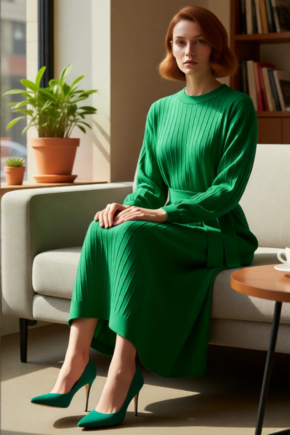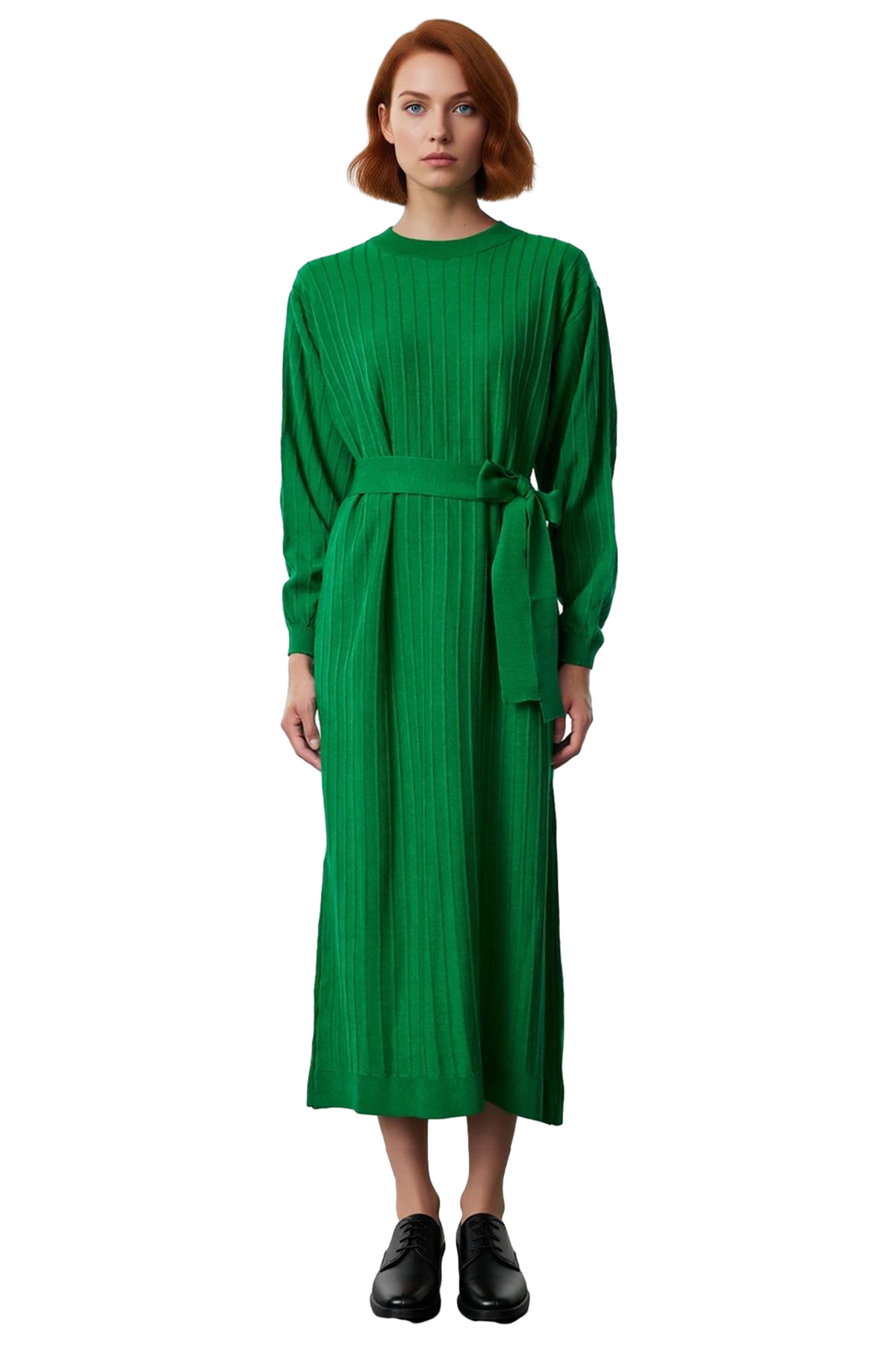 Ürün Özellikleri: Shift kalıp, %100 akrilik materyal, düz desen, bisiklet yaka, balon kol, triko kumaş, yeşil renk, kuşaklı tasarım.