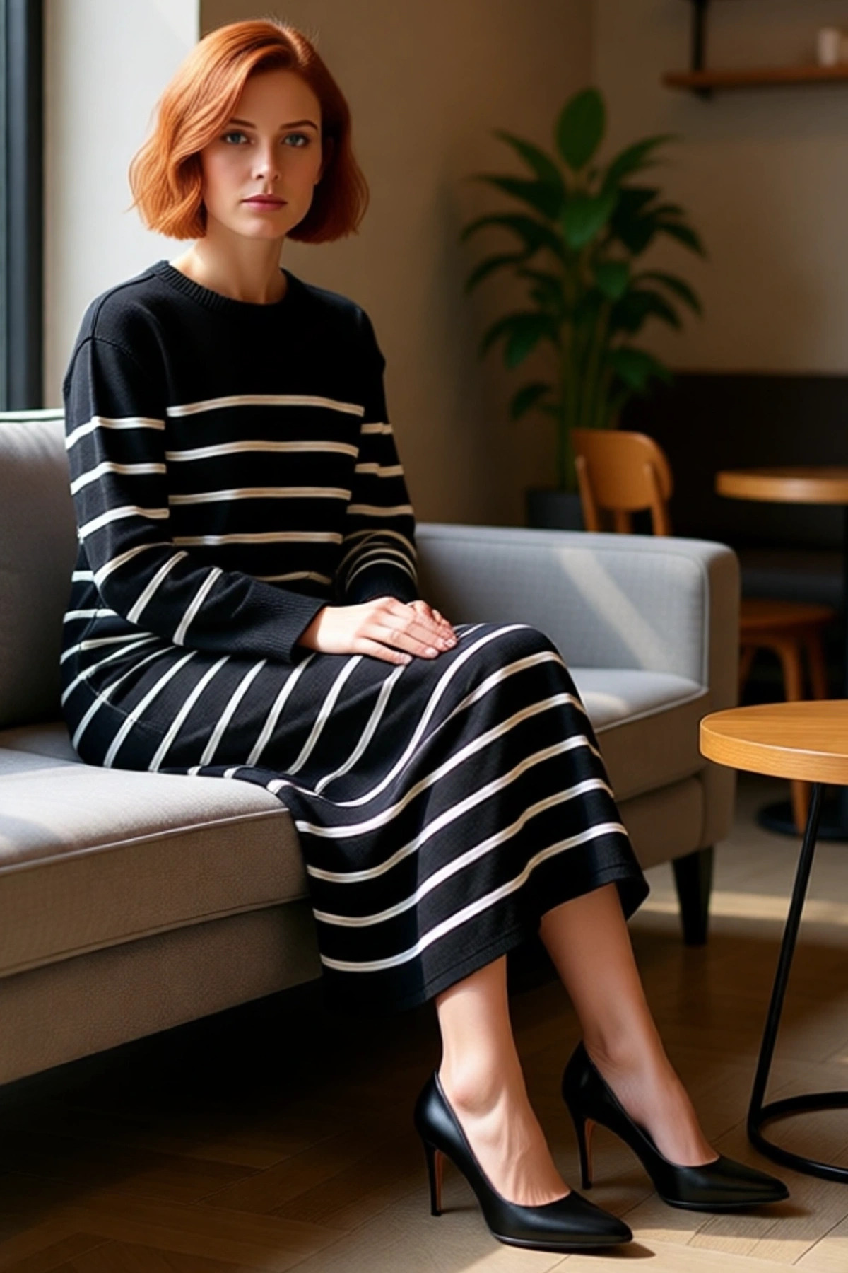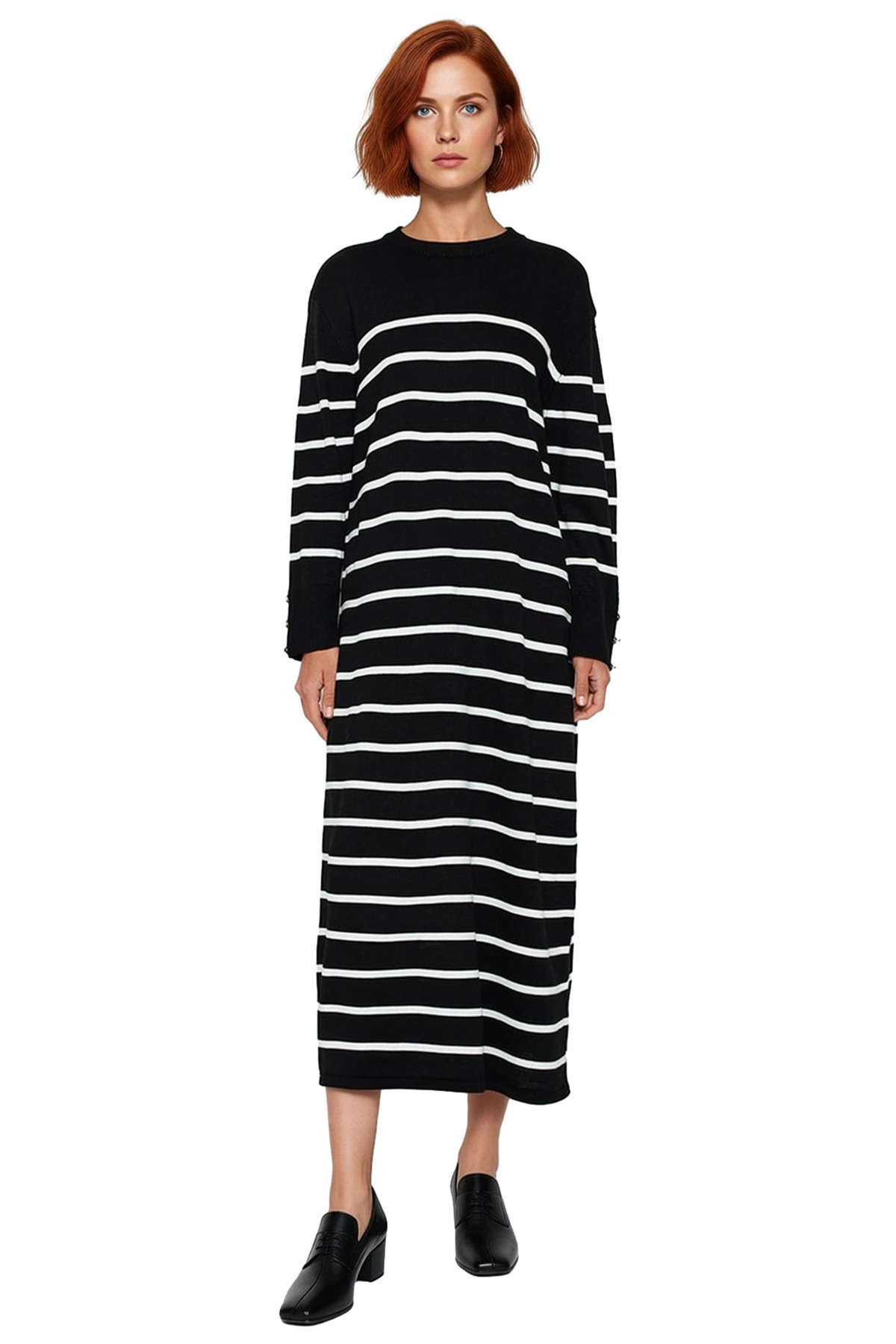 Kadınlar için tasarlanan bu rahat ve şık çizgili triko maxi elbise, modern shift kalıbı sayesinde gün boyu benzersiz bir konfor ve üst düzey hareket özgürlüğü sunar. Yüksek kaliteli %100 akrilik materyalden özenle üretilen bu elbise, soğuk kış ve serin sonbahar günlerinde sizi sıcacık tutarken, cildinize hoş bir his bırakan yumuşacık dokusuyla vazgeçilmeziniz olacak. Klasikleşen çizgili deseni, derin siyah rengin zarafetiyle birleşerek zamansız ve stil sahibi bir görünüm oluşturur. Kollardaki modern düğme detayları, tasarıma sofistike ve özgün bir dokunuş katarken, baskısız yüzeyi minimalist bir estetik sunar.