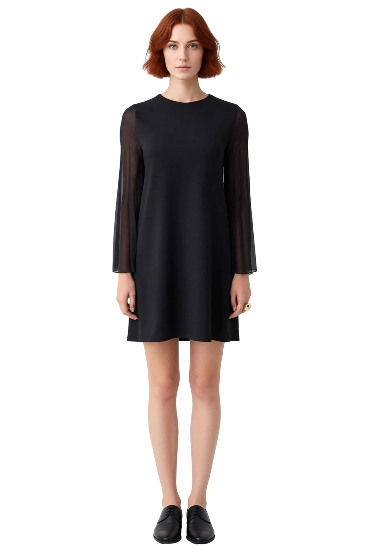 Ürün Özellikleri: Shift kalıp, %98 Polyester %2 Elastan materyal, düz desen, bisiklet yaka, standart kol, örme kumaş (scuba krep), siyah renk, dokuma detaylı.
