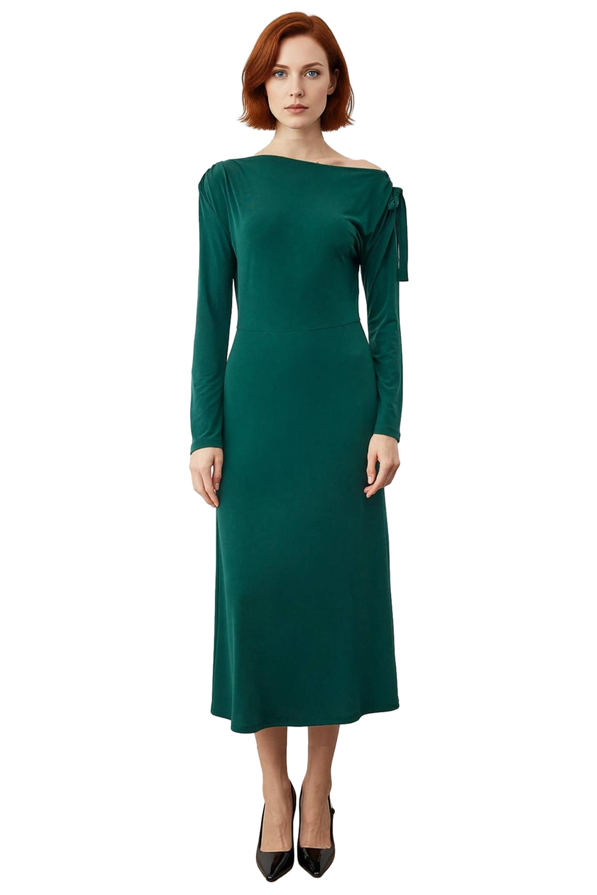 Ürün Özellikleri: A-line kalıp, 96% polyester 4% elastan materyal, düz desen, asimetrik yaka, düşük kol, örme kumaş, yeşil renk, bağlama detaylı tasarım.
