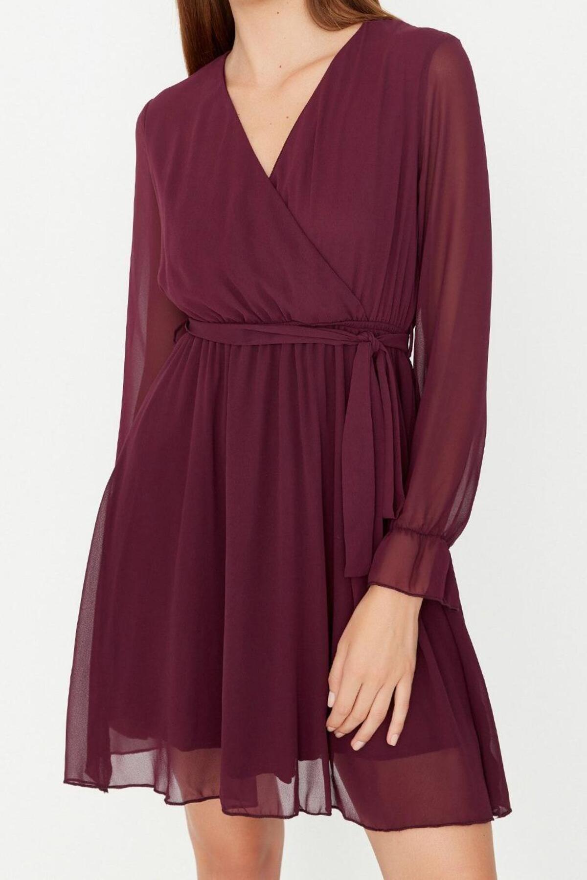 Elbisenin çarpıcı kruvaze yaka tipi, boyun ve dekolte bölgesine zarif bir dokunuş katarken, uzun balon kol detayı hareketli ve şık bir görünüm oluşturur. Balon kolların lastikli kol uçları, estetik bir bitiş sağlarken rahat hareket imkanı sunar. Bel kısmındaki lastikli detay ve kuşaklı kapama şekli, vücudunuzu sararak feminen hatlarınızı ön plana çıkarır ve ayarlanabilir bir bel silueti yaratır. Şifon kumaşın uçuş uçuş yapısı, etek kısmında belden açılan özelliğiyle her adımda zarif bir hareketlilik sunar. Bu cepsiz tasarım, sade ve şık bir bütünlük sağlar.