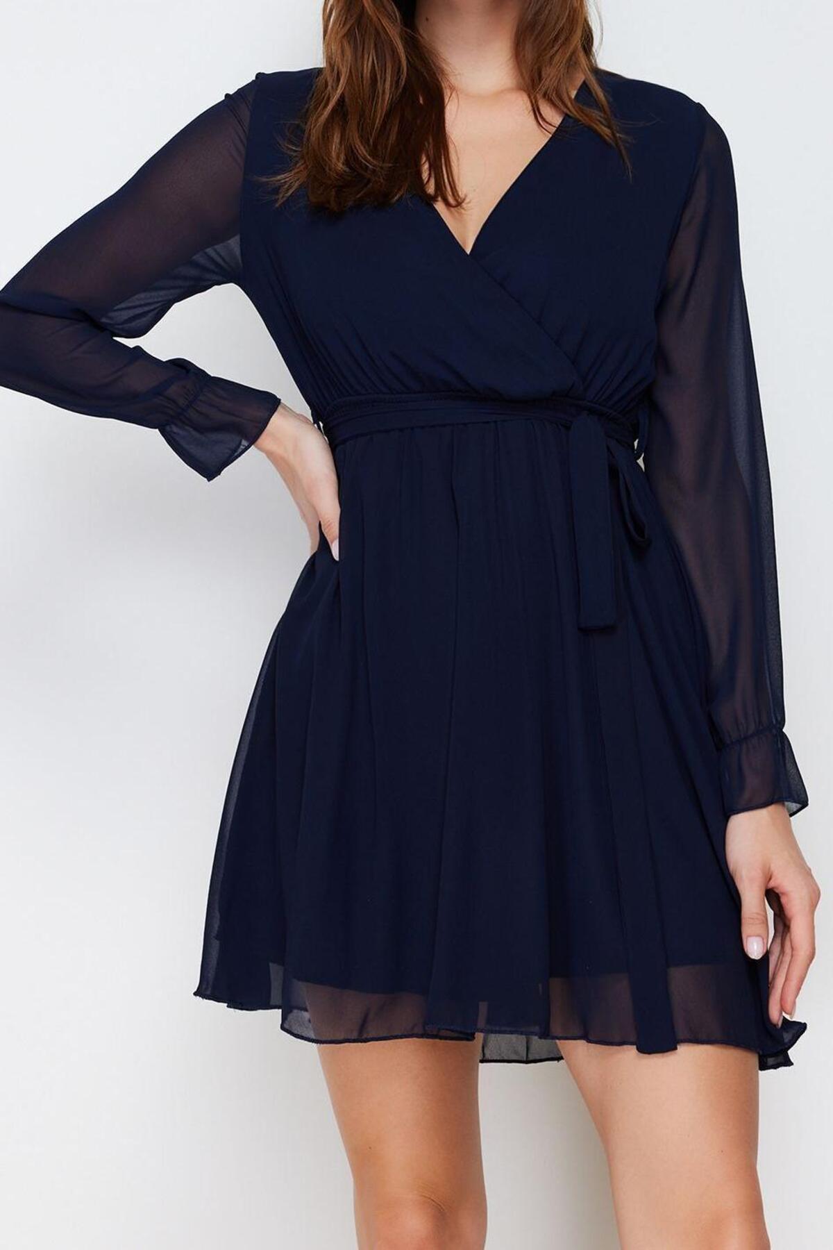 Ürün Özellikleri: Skater kalıp, dokuma materyal, düz desen, kruvaze yaka, balon kol, şifon kumaş, siyah renk, astarlı, kuşaklı, mini boy.