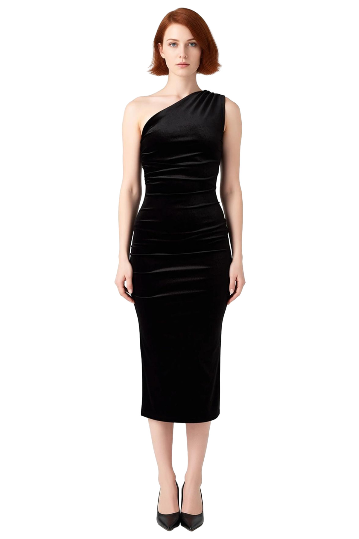 Ürün Özellikleri: Bodycon kalıp, polyester materyal, düz desen, asimetrik yaka, tek omuz kol, örme kadife kumaş, siyah renk.