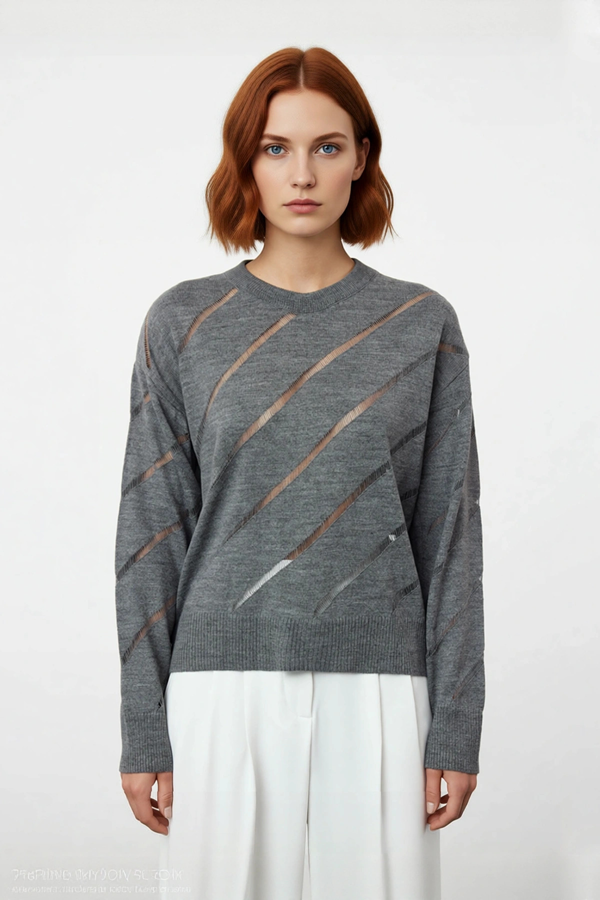 Ürün Özellikleri: Regular kalıp, akrilik materyal, ajurlu desen, bisiklet yaka, düşük kol, triko kumaş, gri renk.
