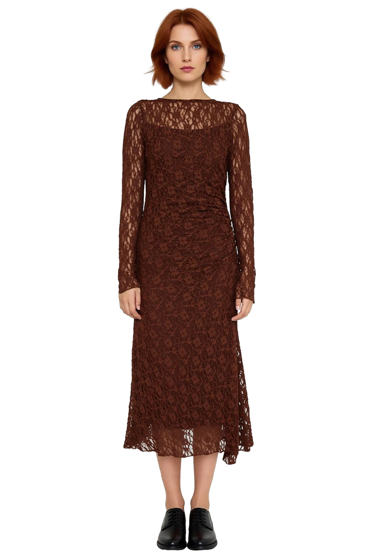 Ürün Özellikleri: Bodycon kalıp, polyester materyal, dantel doku, kayık yaka, standart kol, örme kumaş, kahverengi renk, sırt dekolteli.