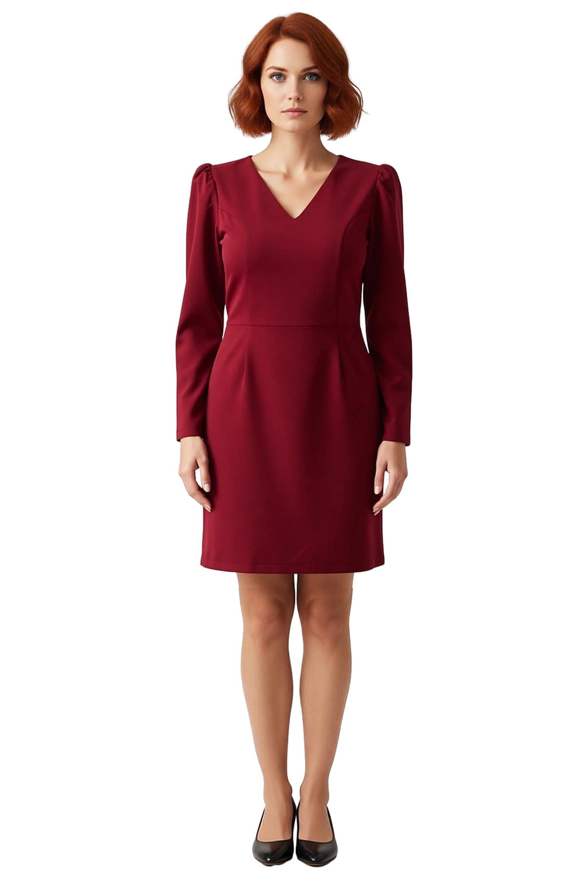 Ürün Özellikleri: Bodycon kalıp, polyester materyal, düz desen, V yaka, standart kol, dokuma kumaş, bordo renk, kısa/mini boy.