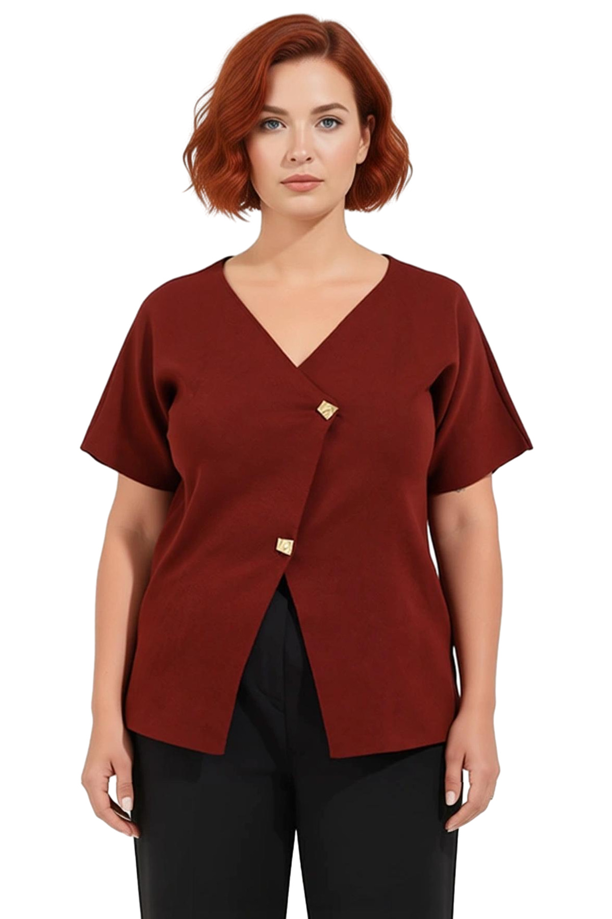 Bu şık triko bluz, modern ve sofistike bir görünüm arayan kadınlar için tasarlandı. Polyesterden üretilmiş, düz desenli ve orta kalınlıkta bir kumaşa sahip olan bu üst, hem şıklığı hem de konforu bir araya getiriyor. V yaka detayı, zarif bir dekolte sunarken, asimetrik düğme kapaması ürüne benzersiz bir karakter katıyor. Düşük omuzlu ve kısa kollu tasarımı, özellikle günlük kullanımda rahatlık sağlıyor. Regular kalıbı sayesinde her vücut tipine uyum sağlayan bu bluz, kruvaze silueti ile de dikkat çekiyor. Casual ve günlük ortamlar için ideal olan bu parça, stil sahibi kadınların gardırobunda yerini almayı hak ediyor. Tek plaka dokuma tekniği ile üretilen bu triko üst, kalitesi ve dayanıklılığı ile öne çıkıyor. Ürünün bakımı için belirtilen T41 yıkama talimatlarına uyulması tavsiye edilir. Türkiye’de üretilen bu bluz, kaliteli malzemesi ve özenli işçiliği ile uzun yıllar kullanılabilecek bir parça. Fashion Forward bir yaklaşımla tasarlanan bu üst, farklı alt giyim ürünleriyle kolayca kombinlenerek çeşitli stil önerileri sunuyor. Pantolonlar, etekler ve hatta şortlarla mükemmel uyum sağlayarak hem gündüz hem de gece şıklığına katkıda bulunuyor. Polyesterin sunduğu pratik bakım avantajı, bu bluzu günlük hayatın koşuşturmacasında tercih edilebilir kılıyor. Bu triko bluz, stilini ön plana çıkarmak isteyen her kadının dolabında bulunması gereken zamansız bir parça.