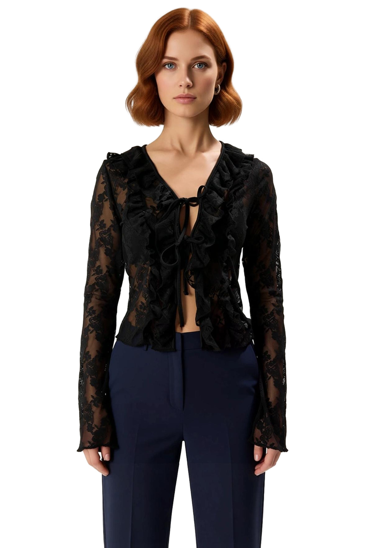 Bu kadın bluzu, feminen ve çekici bir stil arayanlar için idealdir. V yaka kesimi, zarif bir dekolte sunarken, ön kısmındaki fırfır detayları ve bağlama detayı ürüne hareketlilik ve şıklık katıyor. Uzun kollu tasarımı, her mevsim kullanımına uygunluk sağlıyor. Fitted kalıbı sayesinde vücuda oturan bir görünüm sunarken, esnek örme kumaşı sayesinde gün boyu rahatlık vadediyor. Düz deseni, ürünü farklı alt giyim parçalarıyla kolayca kombinlenmesini sağlıyor. Gündüz şıklığından gece davetlerine kadar geniş bir kullanım alanına sahip olan bu bluz, moda trendlerini takip eden kadınların gardıroplarında yerini almalı. %93 polyester ve %7 elastan karışımı kumaşı, hem dayanıklılık hem de yumuşaklık sunuyor. Ürünün bakımı için belirtilen yıkama talimatlarına (Hassas Yıkama) dikkat edilmesi, uzun ömürlü kullanım için önemlidir. Bu ürün, Türkiye’de özenle üretilmiştir.