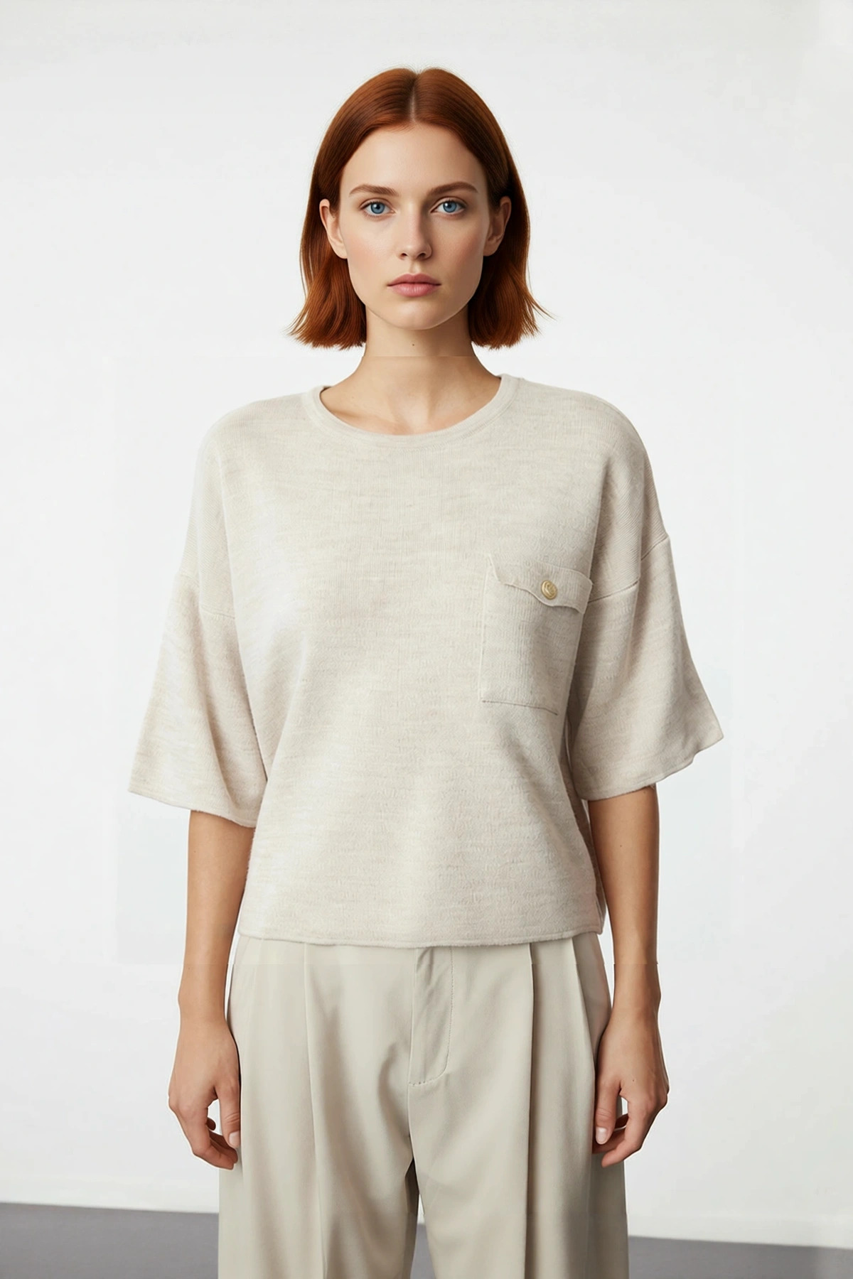 Ürün Özellikleri: Regular kalıp, akrilik materyal, düz desen, bisiklet yaka, kısa kol, triko kumaş, bej renk, cep detaylı.