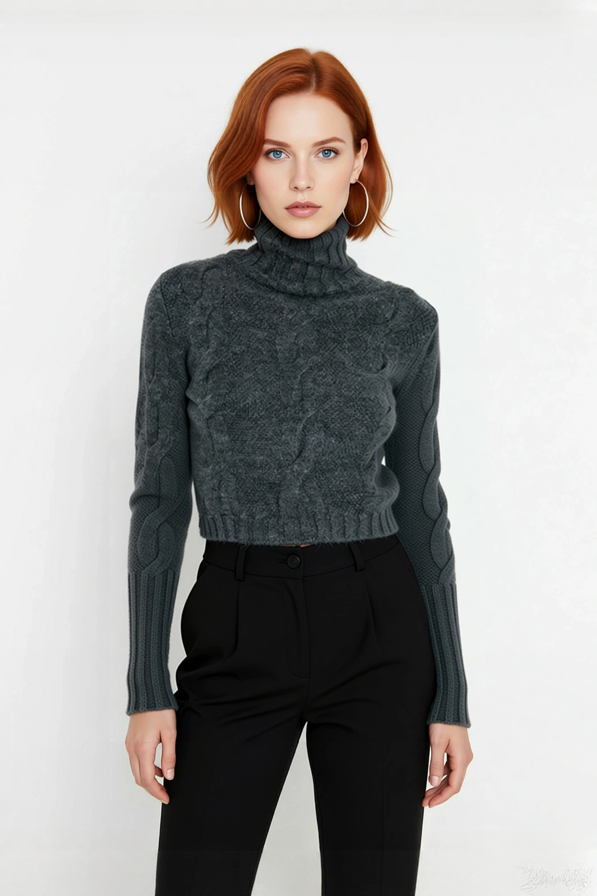 Ürün Özellikleri: Regular kalıp, akrilik materyal, saç örgü desen, dik yaka, standart kol, triko kumaş, gri renk, cepsiz tasarım.