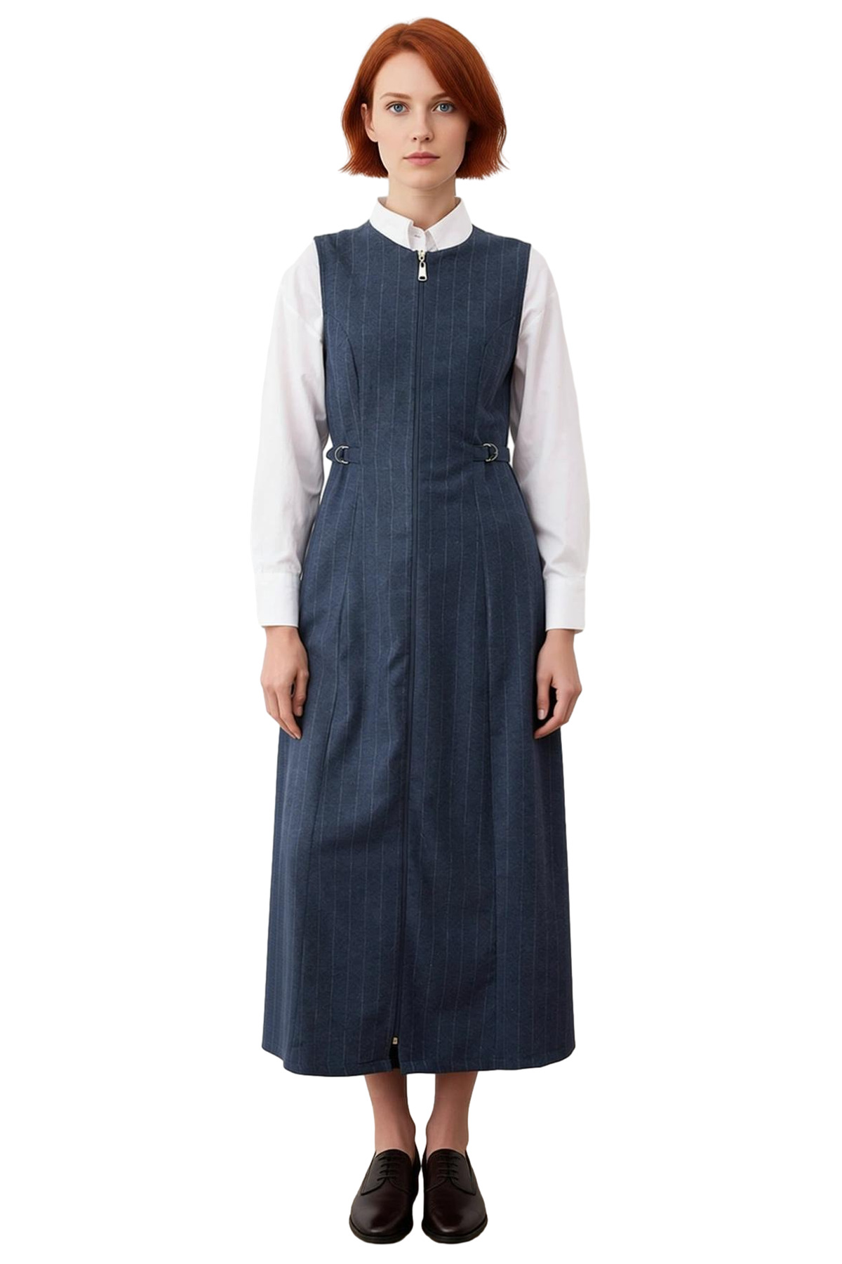 Elbisenin bisiklet yaka tasarımı modern bir çizgi sunarken, kolsuz kesimi sayesinde farklı bluzlar ve gömleklerle kolayca katmanlı kombinler oluşturulabilir. Poliviskon dokuma kumaşı, hava alabilen yapısıyla cildinize nefes aldırır ve astarsız olmasına rağmen iç göstermez. Ön kısmında bulunan boydan boya fermuar detayı, elbiseye çağdaş bir hava katarken giyip çıkarmayı oldukça pratik hale getirir. Bel kısmındaki dekoratif metal D-halkalar, tasarıma şık bir dokunuş eklerken maxi boyu uzun ve asil bir siluet sağlar.