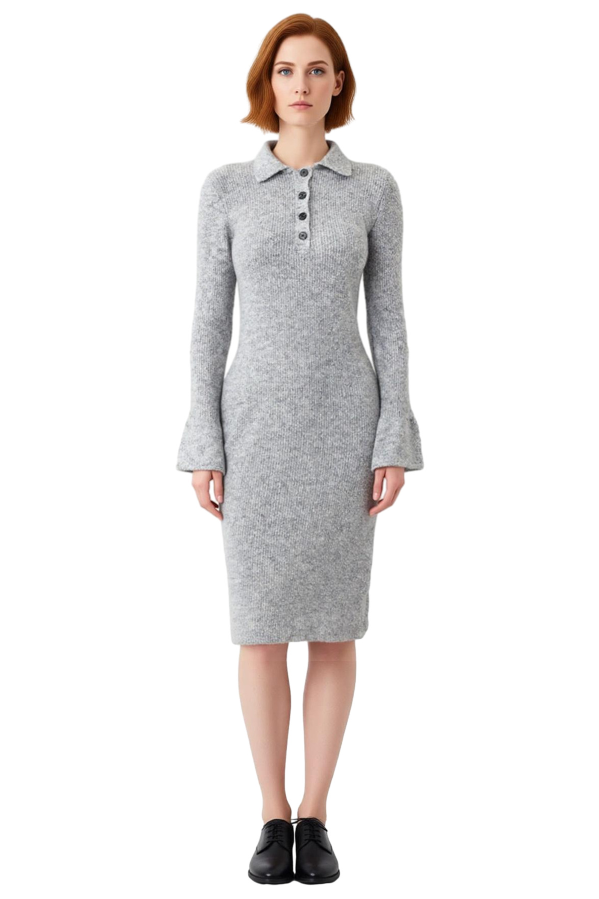 Ürün Özellikleri: Bodycon kalıp, akrilik ve polyester materyal, degrade desen, polo yaka, uzun ispanyol kol, triko kumaş, gri renk, astarsız, midi boy, selanik dokuma.