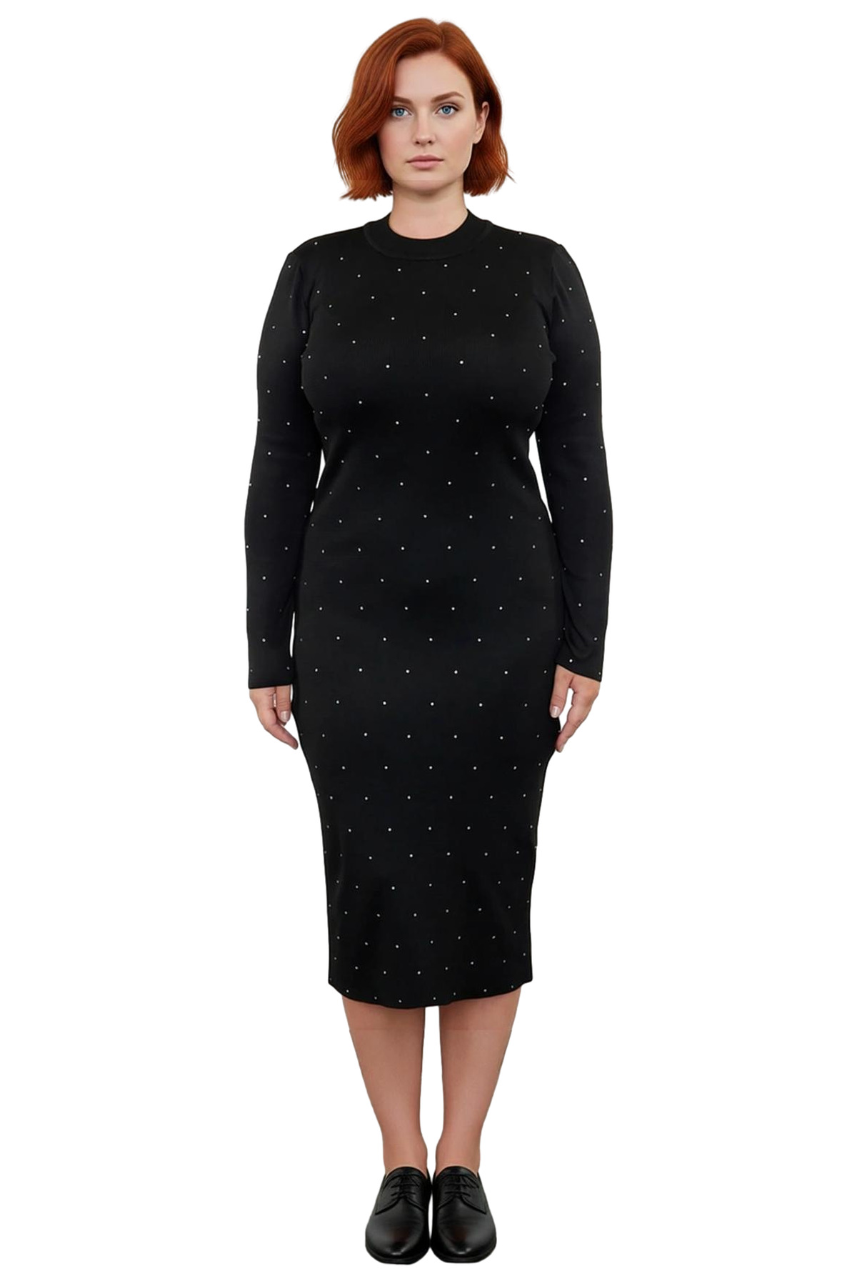 Ürün Özellikleri: Bodycon kalıp, %100 polyester materyal, taş detaylı düz desen, bisiklet yaka, standart kol, triko kumaş, siyah renk.
