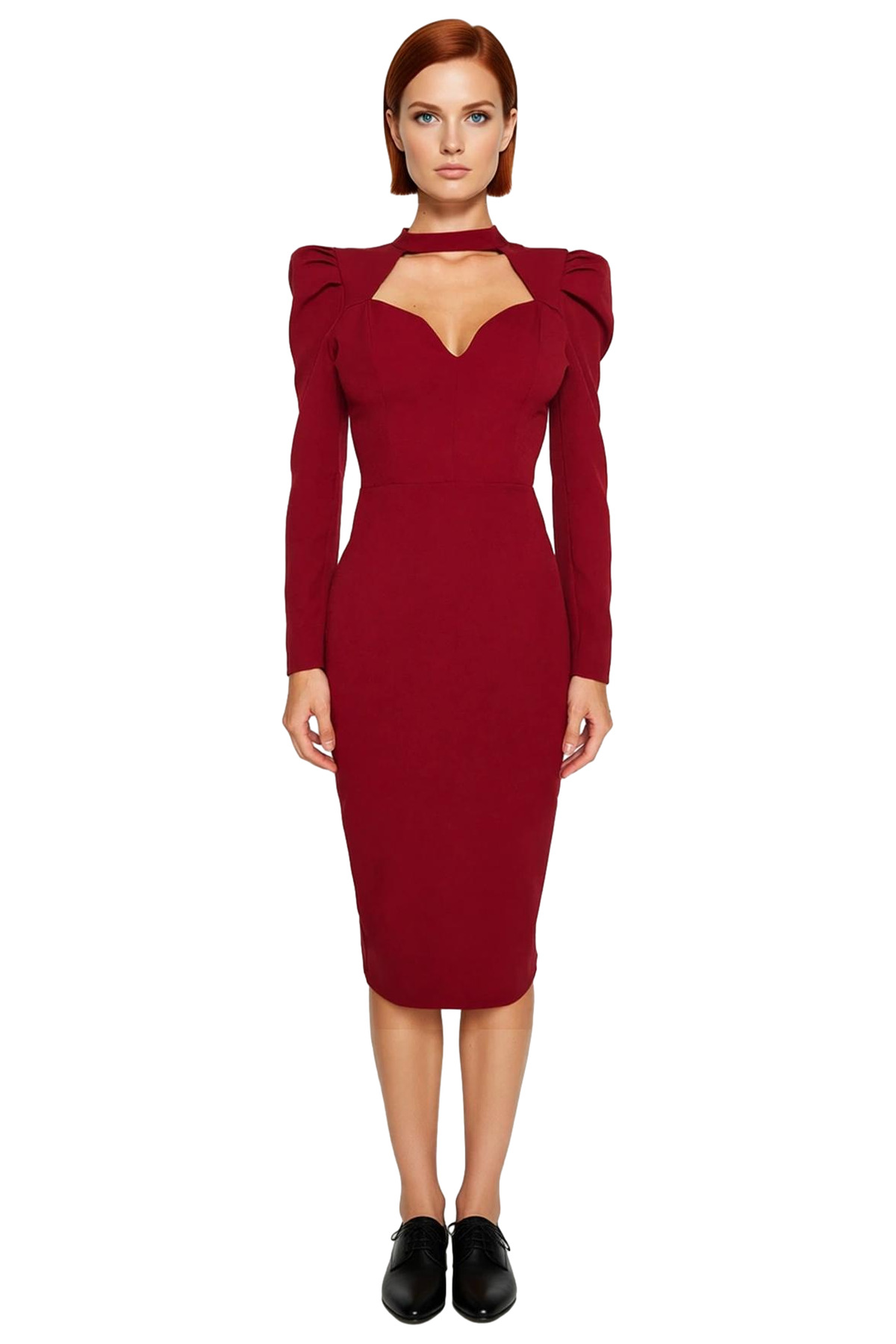 Ürün Özellikleri: Bodycon kalıp, dokuma materyal, düz desen, kalp yaka, uzun balon kol, Finike dokuma kumaş, bordo renk, baskısız tasarım.