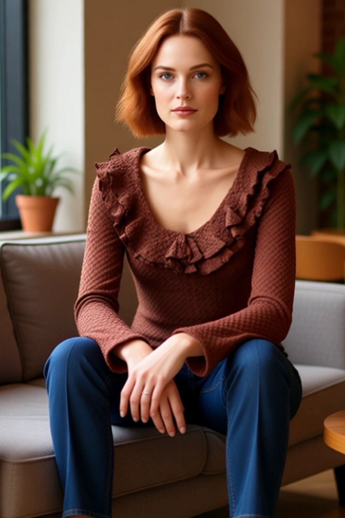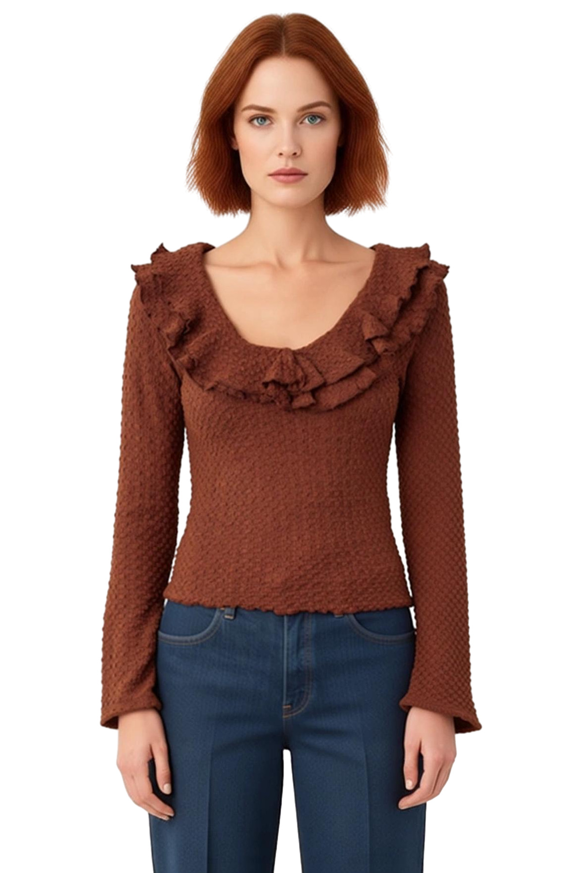 Bu üst, modern kadının stilini ve konforunu bir araya getiren özel bir tasarımdır. Esnek örme kumaşı, vücut hatlarını nazikçe sararak kusursuz bir uyum sağlar ve hareket özgürlüğünü kısıtlamaz. Vücuda oturan kalıbı, zarif bir silüet oluştururken, her vücut tipine uyum sağlama potansiyeli taşır. Uzun kollu tasarımı, soğuk günlerde sıcaklık sunarken, şık ve sofistike bir görünüm kazandırır. Ürünün en dikkat çekici özelliği, yaka çevresindeki zarif fırfır detaylarıdır. Bu fırfırlar, üstün genel tasarımına romantik ve feminen bir hava katarken, aynı zamanda göz alıcı bir odak noktası oluşturur. Düz deseni, fırfır detaylarının ve dokunun öne çıkmasına yardımcı olur. Havuz yaka tipi, boyun çizgisini hoş bir şekilde çerçeveler. Kumaşın gofre dokusu, ürüne benzersiz bir derinlik ve zenginlik katarak, sıradan örme kumaşlardan ayrılmasını sağlar. Materyal bileşeni %97 viskoz ve %3 likradan oluşmaktadır. Bu kombinasyon, kumaşın yumuşaklığını, nefes alabilirliğini ve esnekliğini garanti eder. Viskozun ipeksi dokusu, cilde nazikçe dokunurken, likra sayesinde üst, gün boyu formunu korur ve rahat bir kullanım sunar. Regular boyu, farklı alt giyim seçenekleriyle kolayca eşleştirilebilir. Casual ve günlük kullanım için ideal olan bu üst, şık bir pantolonla veya jeanlerle mükemmel bir uyum sergiler. Kış sezonunda rahatlıkla tercih edilebilecek bu ürün, hem stil sahibi hem de konforlu bir seçenek arayan kadınlar için biçilmiş kaftandır. Üretim yeri Türkiye’dir. Bu üst, gardırobunuzun vazgeçilmez parçalarından biri olacak, her durumda şıklığınızı tamamlayacaktır.