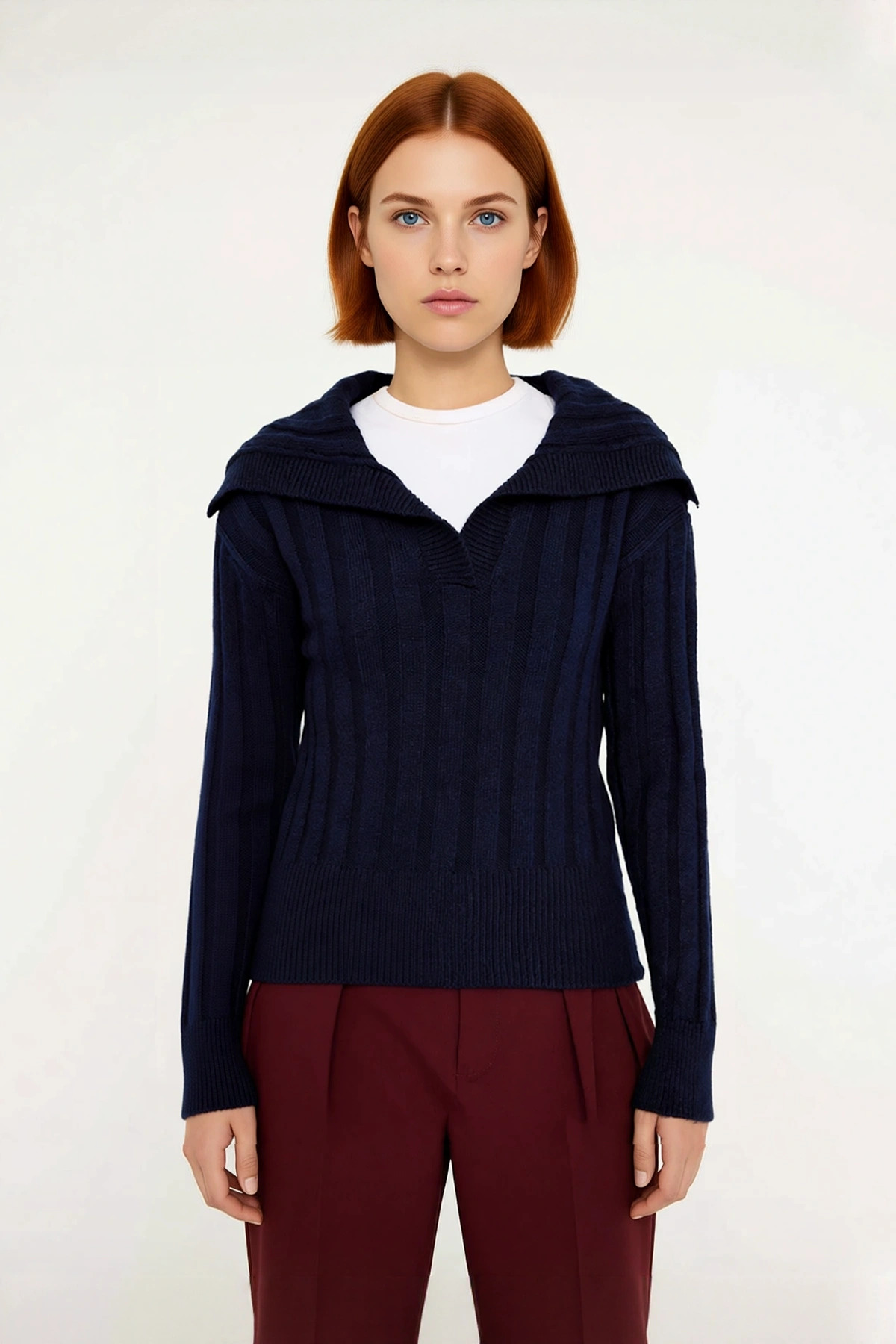 Ürün Özellikleri: Regular kalıp, triko materyal, düz desen, devrik yaka, düşük kol, orta kalınlık, crop boy, tek plaka dokuma, lacivert renk, uzun kol boyu, casual/günlük ortam.