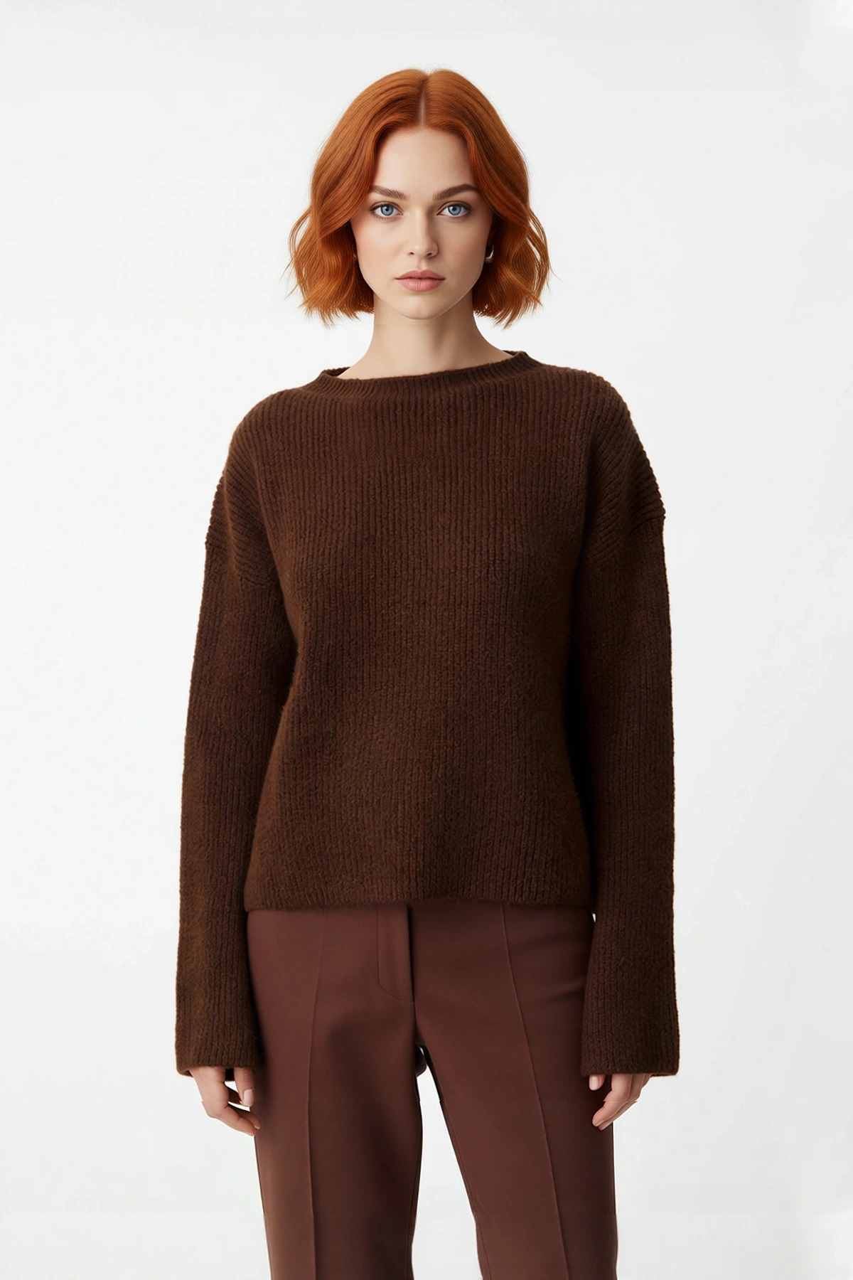 Ürün Özellikleri: Oversize kalıp, 74% Akrilik 26% Polyester materyal, düz desen, bisiklet yaka, düşük kol, triko kumaş, kahverengi renk, kalınlık, crop boy.
