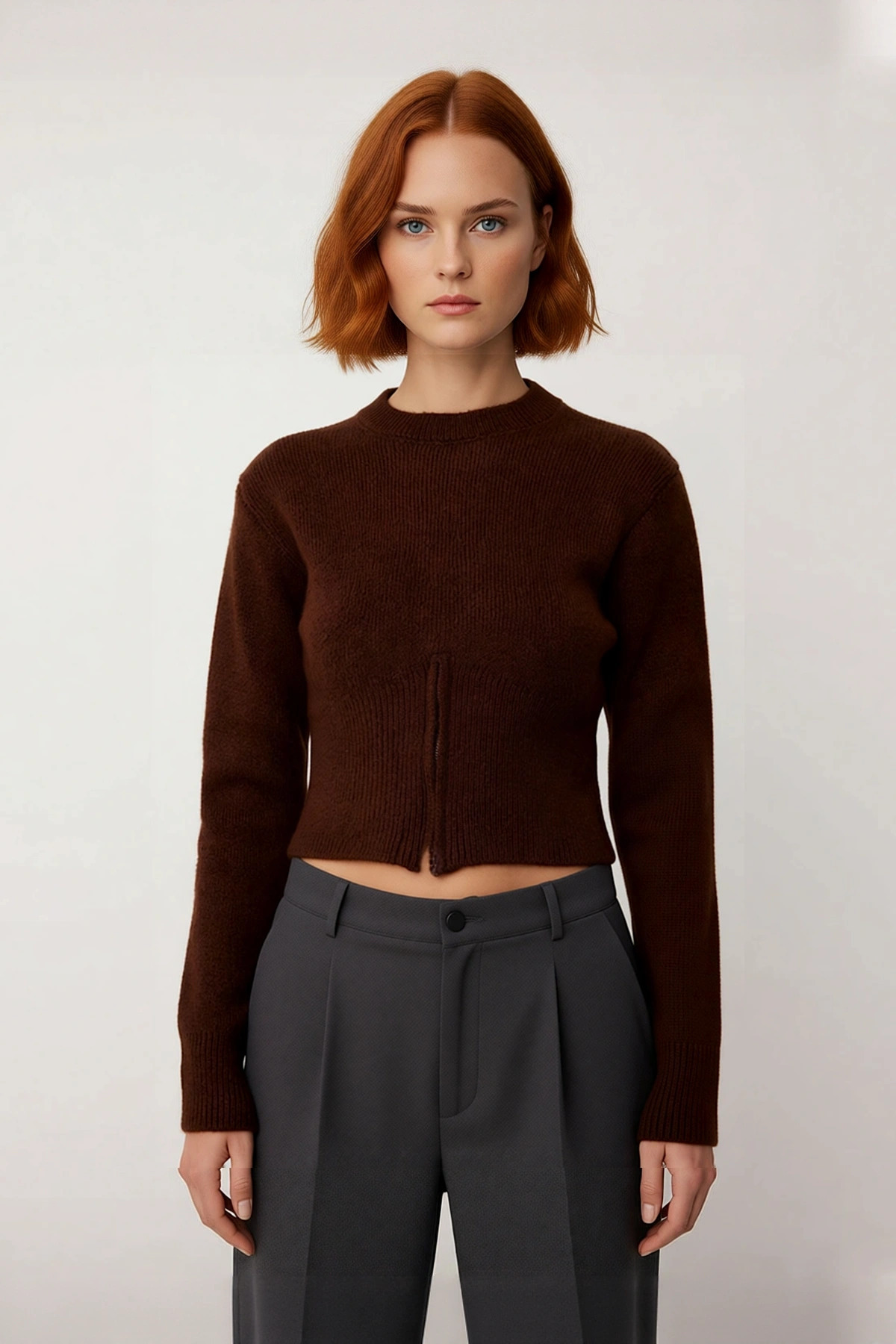 Kadınlara Özel Regular Kalıp Crop Boy Triko Bisiklet Yaka Fermuar Detaylı Düz Kalın Kazak Kaliteli