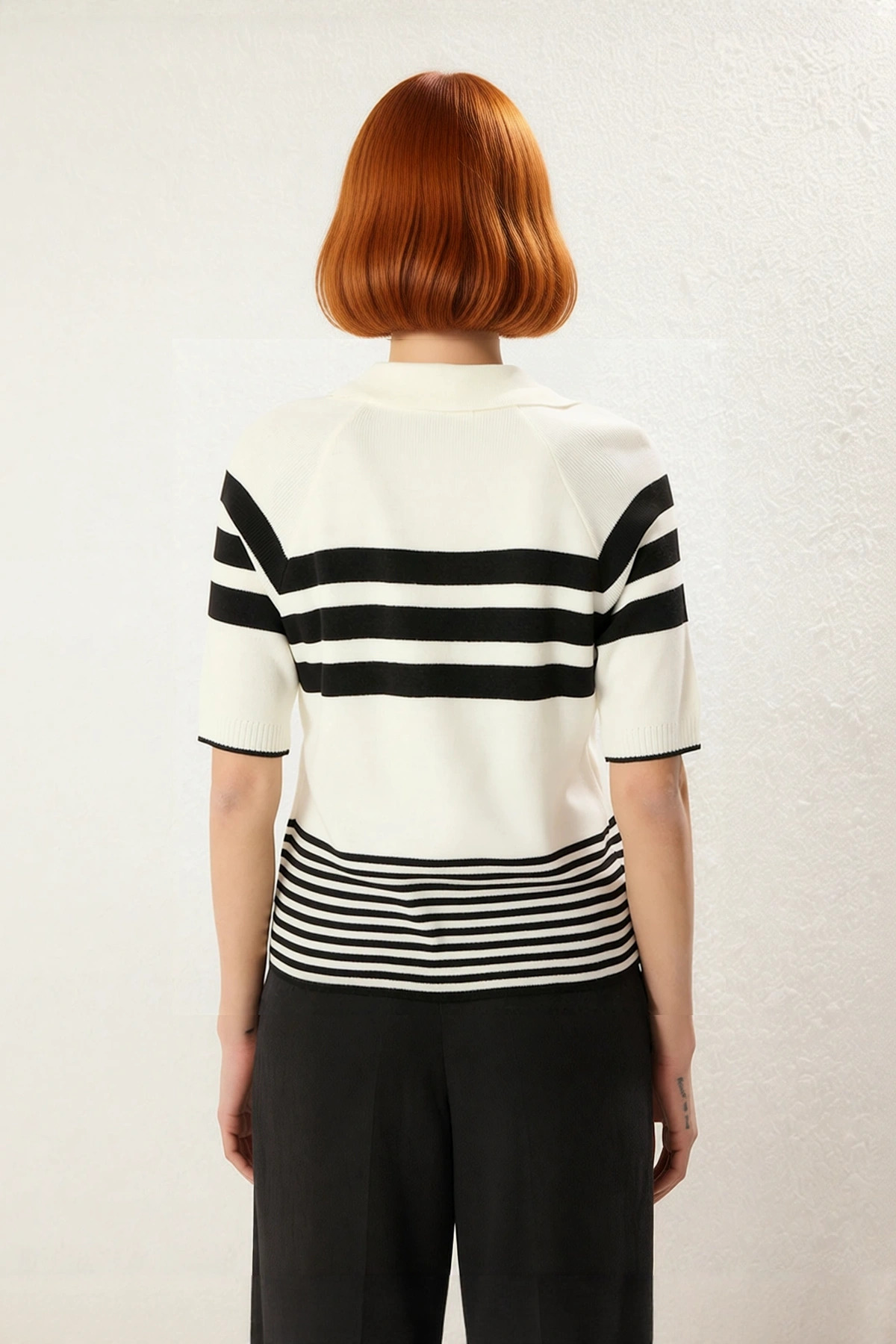 Ürün Özellikleri: Regular kalıp, 100% akrilik materyal, renk bloklu desen, polo yaka, kısa standart kol, ince triko kumaş, ekru renk.