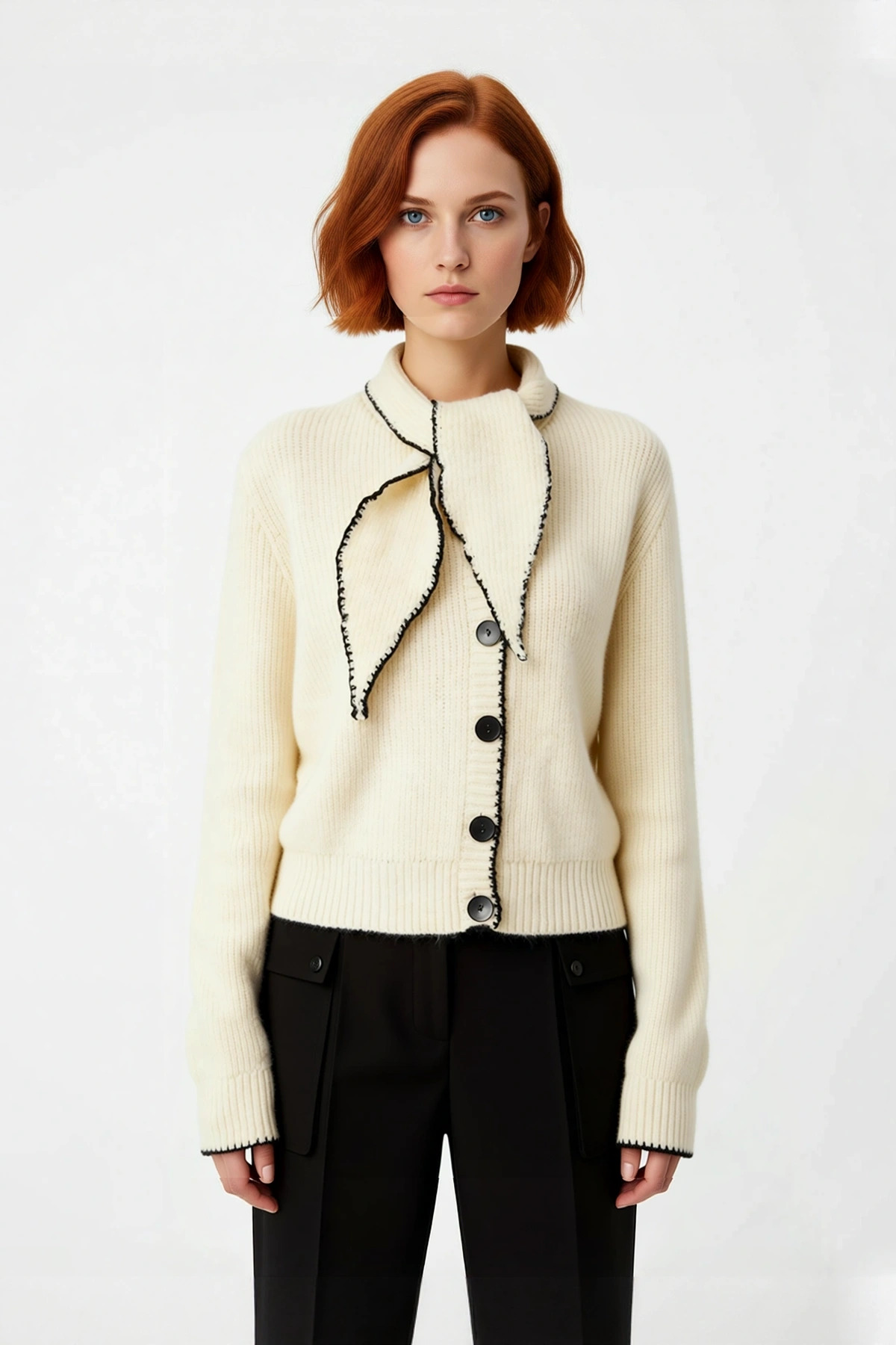 Ürün Özellikleri: Regular kalıp, 70% akrilik 30% polyester materyal, renk bloklu desen, fular yaka, standart kol, triko kumaş, bej renk.