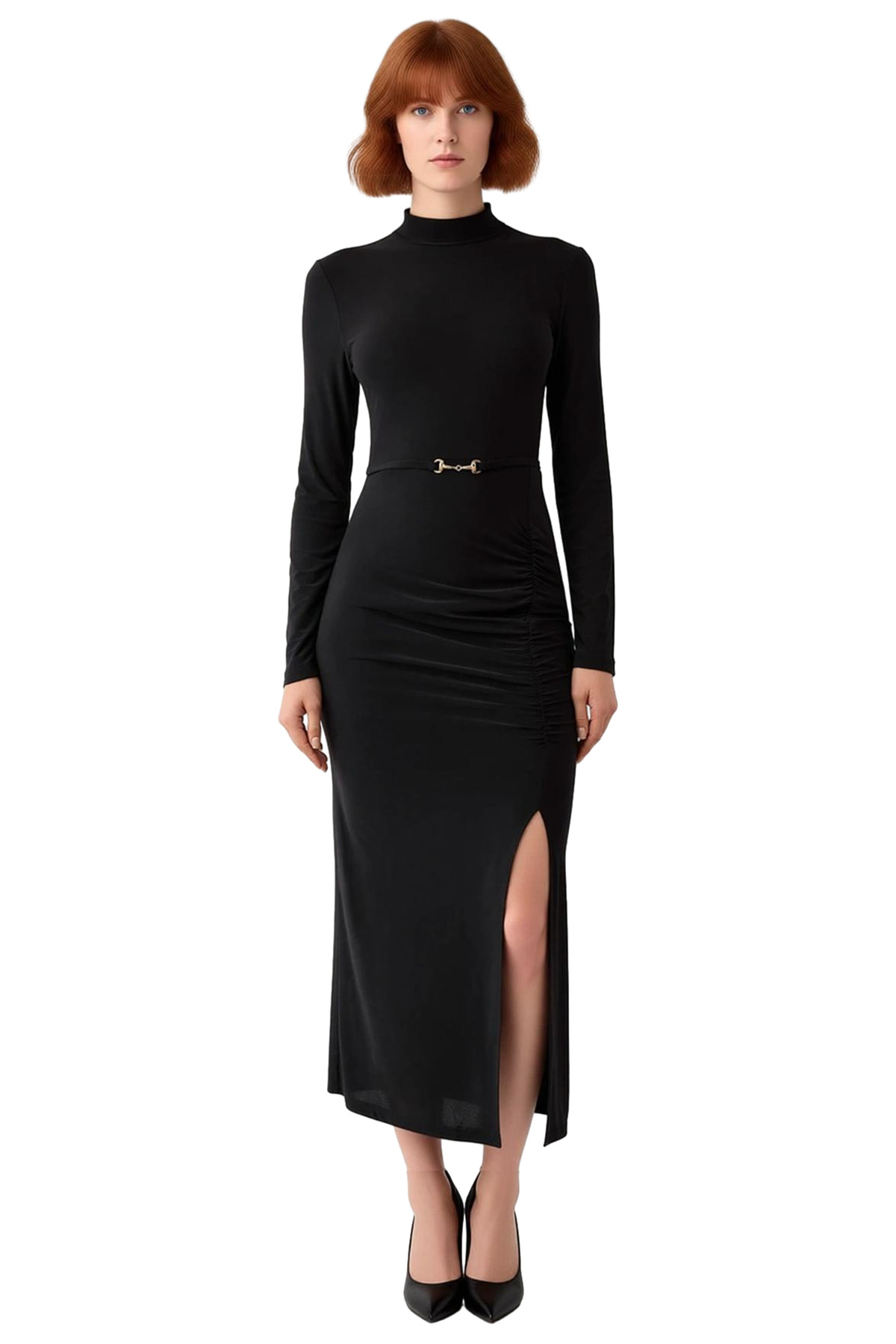 Ürün Özellikleri: Bodycon kalıp, polyester elastan materyal, düz desen, dik yaka, standart kol, örme kumaş, siyah renk, aksesuar detaylı.