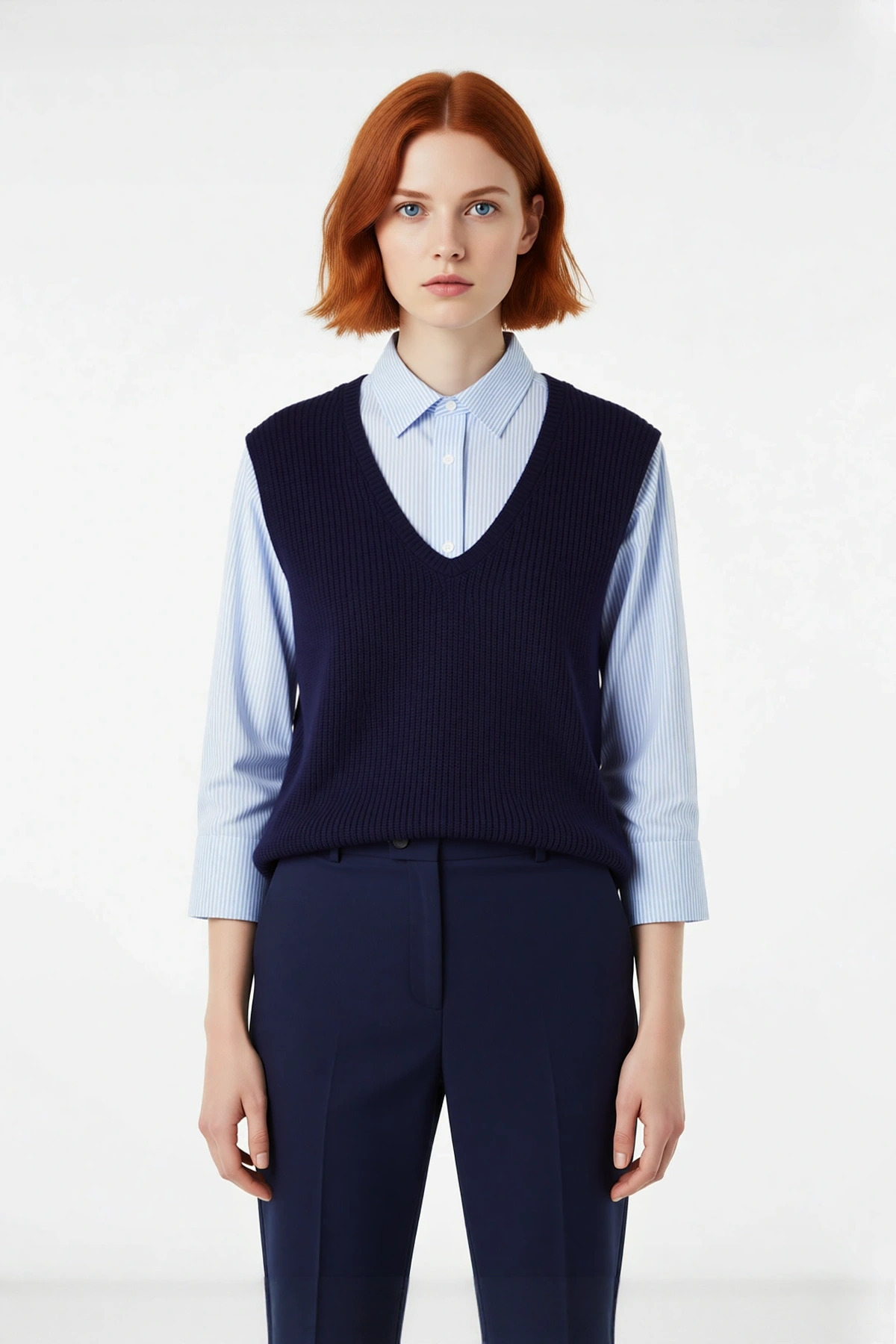 Ürün Özellikleri: Relaxed kalıp, 100% akrilik/pamuk materyal, çizgili desen, V yaka, düşük kol / uzun kol, triko kumaş, lacivert renk, orta kalınlık.
