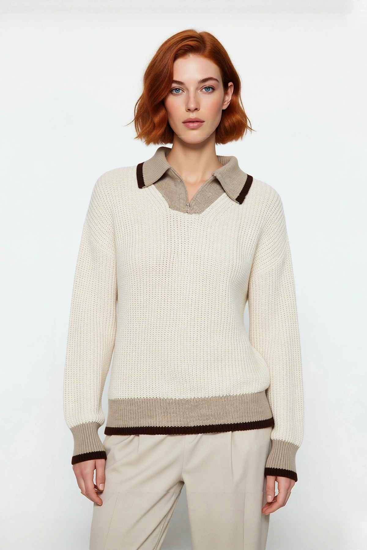 Ürün Özellikleri: Regular kalıp, %100 akrilik materyal, renk bloklu desen, dik yaka, standart kol, triko kumaş, bej renk, fermuarlı, orta kalınlık, cepsiz.