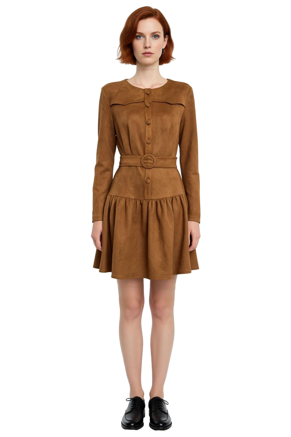 Ürün Özellikleri: Skater kalıp, polyester karışımlı materyal, düz desen, yuvarlak yaka, standart kol, süet dokuma kumaş, kahverengi renk, baskısız tasarım, kemerli.