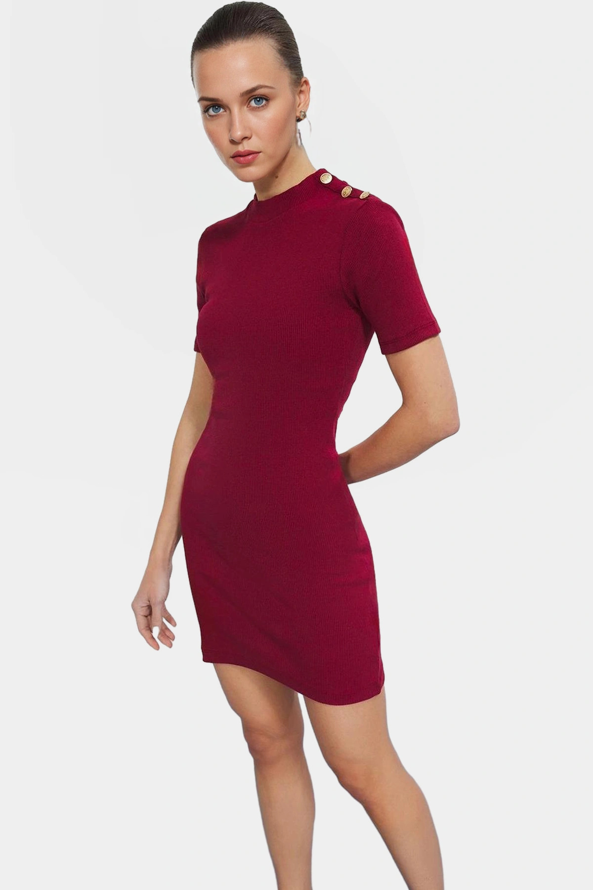 Kaşkorse Örme Mini Elbise Vücuda Oturan Düğmeli Kısa Kol Rahat Ve Şık Konforlu Kesim