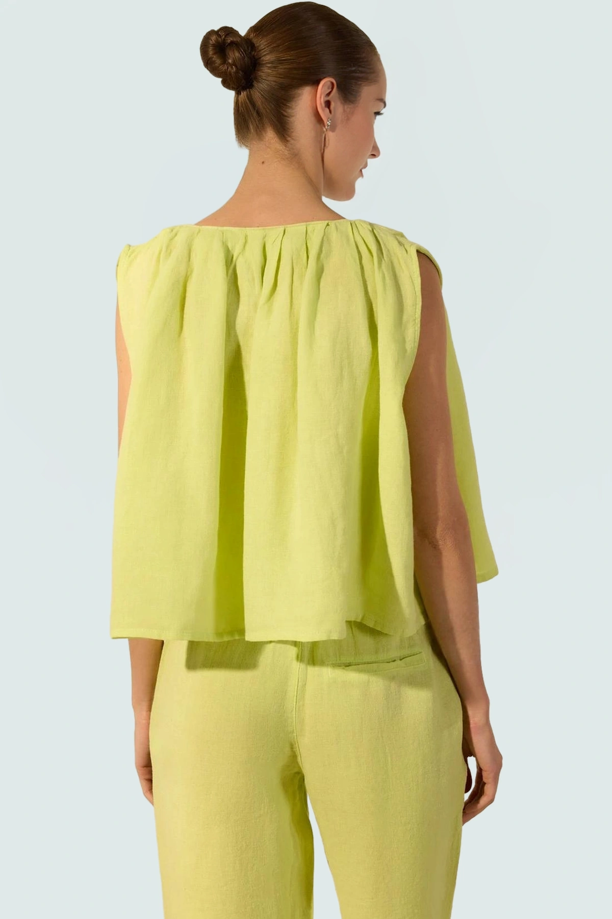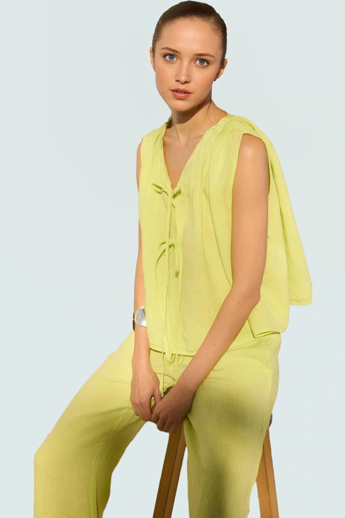 %100 keten kumaştan üretilen bu bluz, doğal yapısıyla cilt dostu ve nefes alabilir. Regular kalıbı sayesinde her vücut tipine rahatlıkla uyum sağlar. Kolsuz tasarımı, sıcak yaz günlerinde serinlik hissi verirken, dik yaka ve bağlama detayı bluza şık bir görünüm kazandırıyor. Basit silueti ile her ortama uyum sağlar. Günlük kullanım için ideal olan bu bluzu, dilerseniz şık aksesuarlarla tamamlayarak daha özel bir görünüm elde edebilirsiniz.