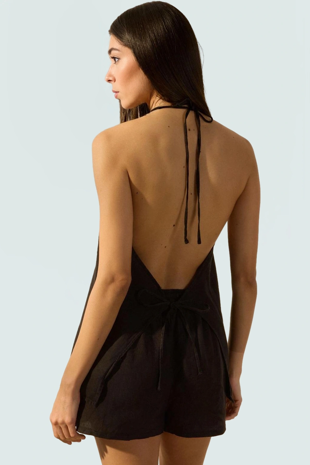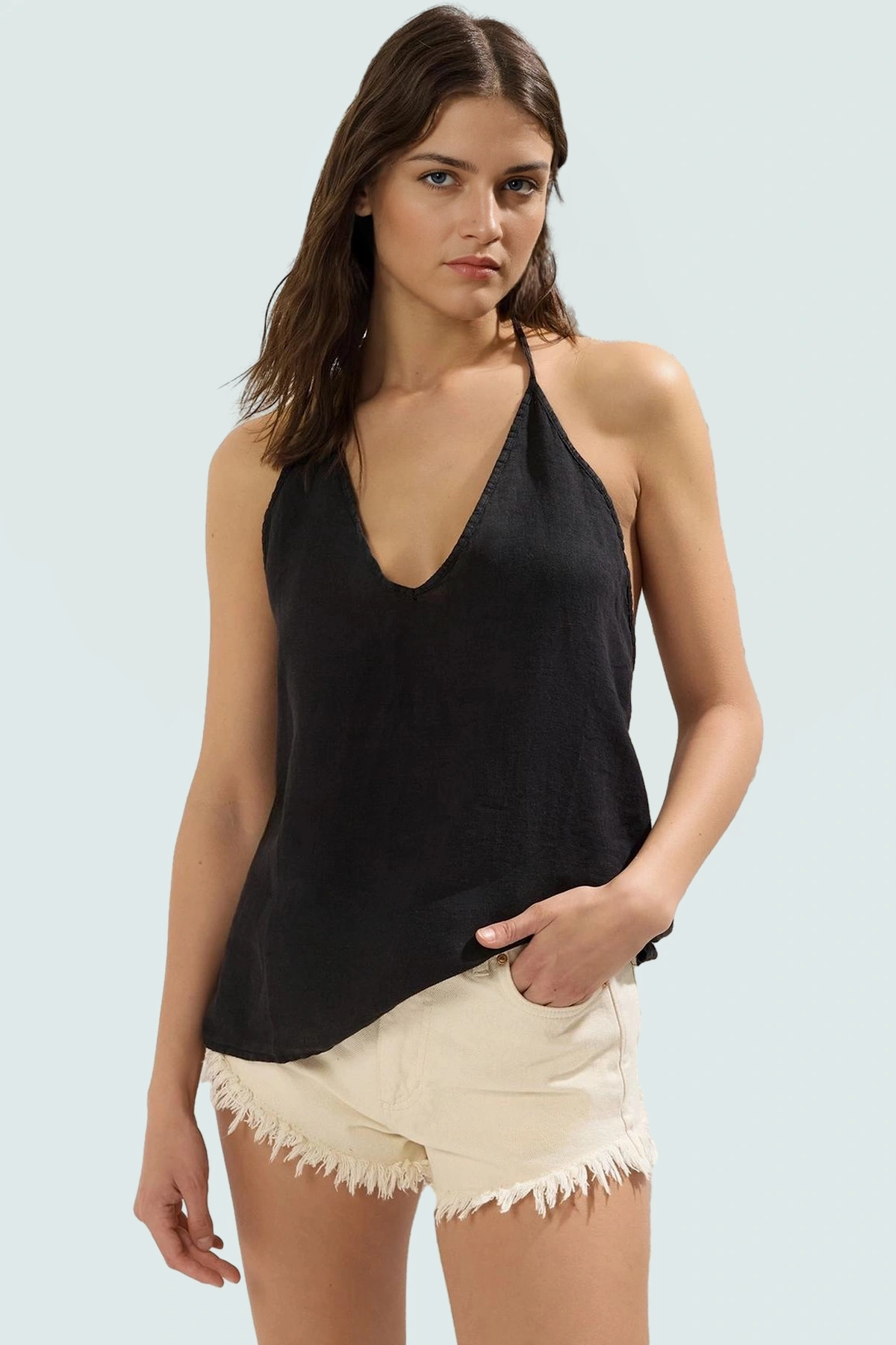 Rahatlığı ve şıklığı bir arada sunan bu siyah keten bluz, yaz aylarının vazgeçilmez parçası olacak. Yüksek kaliteli 100% keten kumaştan üretilen bluz, doğal dokusuyla cildinizde serin ve yumuşak bir his bırakırken, şık tasarımıyla da her ortamda göz alıcı görünmenizi sağlar. Boyundan bağlamalı detayı ile feminen bir hava katarak tarzınıza zarafet katar.
