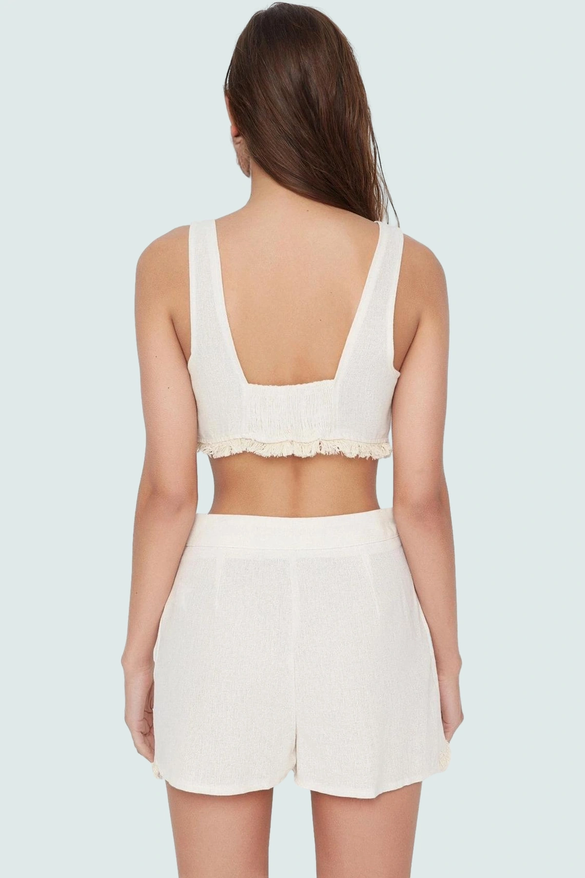 Bu yaz, plajda ve günlük hayatta şıklığı ve rahatlığı bir arada yaşayın! Bej renk, dokuma keten görünümlü kumaştan üretilen bu bluz şort takımı, modern ve feminen tasarımıyla dikkat çekiyor. V yaka bluz, kısa boylu şort ile mükemmel uyum sağlıyor. Boru paça detayı şıklığı tamamlarken, regular kalıp rahatlığı ön planda tutuyor. Püskül detayı ise takıma özgün bir hava katıyor.