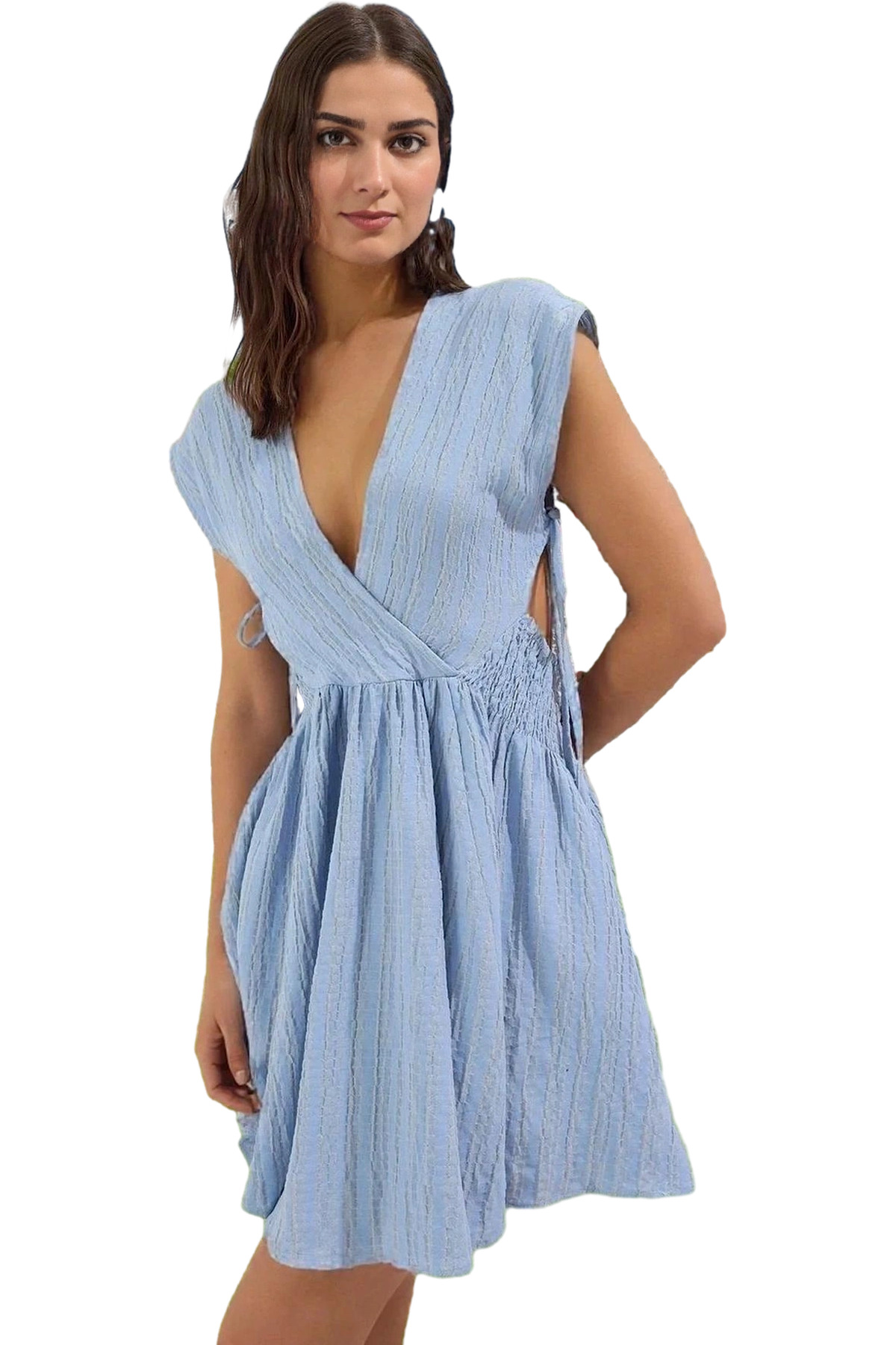 Yüksek kaliteli keten karışımı kumaşı, nefes alabilir, dayanıklı ve kolay bakımlıdır. Polyester ve pamuk katkıları sayesinde uzun ömürlü kullanım sunar. Hafif ve akıcı yapısı sayesinde gün boyu rahat hareket edebilirsiniz. V yaka detayı ve mini boyu ile sıcak havalarda tarzınızı tamamlayacak mükemmel bir seçim.
