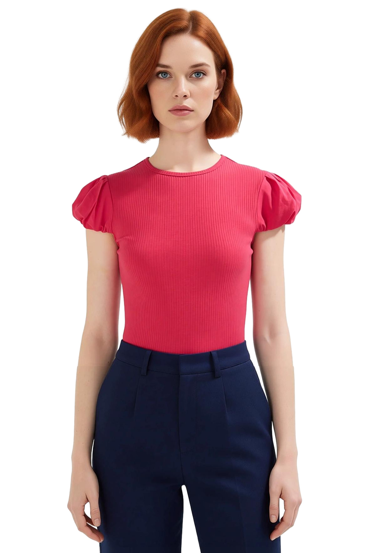 Yumuşak ve esnek yapısıyla gün boyu rahatlık sunan bu kısa kollu bluz, gardırobunuzun vazgeçilmezi olacak! Pamuklu kumaşıyla teninize nazikçe dokunurken, şık tasarımıyla da her ortamda göz alıcı görünmenizi sağlar. Fitted kalıbı sayesinde vücudunuza mükemmel uyum sağlayarak, zarif ve modern bir siluet oluşturur. Bisiklet yakası ve büzgülü kollarıyla feminen bir tarz yakalarken, dokuma detayları ise bluza ayrı bir hava katar.