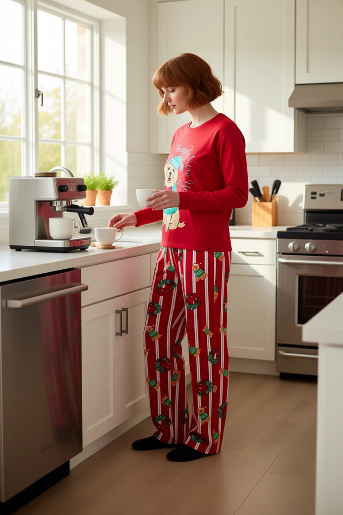 Bu sevimli ve neşeli pijama takımı, küçük kızların hayal dünyasına hitap edecek şekilde tasarlandı. Üst kısımda, şirin bir köpek figürü ve ‘Happy New Year’ yazısı ile dikkat çeken, bisiklet yaka ve uzun kollu bir tişört bulunuyor. Tişörtün canlı kırmızı rengi, kışın kasvetini dağıtacak bir enerji katıyor. Alt kısımda ise kırmızı zemin üzerine beyaz çizgiler ve sevimli köpek baskılarıyla bezeli, rahat kesimli bir pantolon yer alıyor. Takımın tamamı, %100 pamuk ipliği ile üretilmiş, 30/1 openend süprem örme kumaştan yapılmıştır. Bu doğal malzeme, çocukların hassas cildine nazikçe dokunarak gün boyu süren bir konfor ve güvenli bir kullanım sunar. Yılbaşı temalı bu özel tasarım, çocukların uyku saatlerini daha keyifli hale getirecek. Takımın bisiklet yaka üstü, standart kesimiyle hareket özgürlüğünü kısıtlamazken, uzun kolları soğuk havalarda ekstra sıcaklık sağlar. Pantolonun rahat kesimi ve normal beli, çocukların oyun oynarken veya uyurken rahat etmelerini sağlar. Üstteki köpek baskısı, çocukların ilgisini çekecek sevimli detaylara sahipken, pantolondaki ince çizgiler ve desenler de takıma eğlenceli bir dokunuş katıyor. %100 pamuk içeriği sayesinde nefes alabilen bir yapıya sahip olan bu pijama takımı, çocukların cildinin tahriş olmasını önler ve yumuşak dokusuyla rahat bir uyku deneyimi sunar. Çocukların evdeki zamanını daha eğlenceli hale getirecek bu takım, hem şık hem de konforlu bir seçenek sunar. Kış mevsiminin soğuk günlerinde çocuklarınızı sıcak tutacak bu pijama takımı, evde rahat bir gün geçirmeleri için idealdir. Bu takımı, yumuşak ev terlikleri ve rahat bir hırka ile kombinleyerek tam bir ev giyimi seti oluşturabilirsiniz. Ayrıca, hafta sonu oyun saatlerinde veya sabahları kahvaltı hazırlarken de bu rahatlığı yaşayabilirler. %100 pamuk kumaşı sayesinde kolayca yıkanabilir ve uzun ömürlü kullanım sunar. Ürünün bakımı için, renkli deterjan kullanarak ve ters çevirerek 30 derecede yıkamanız önerilir.