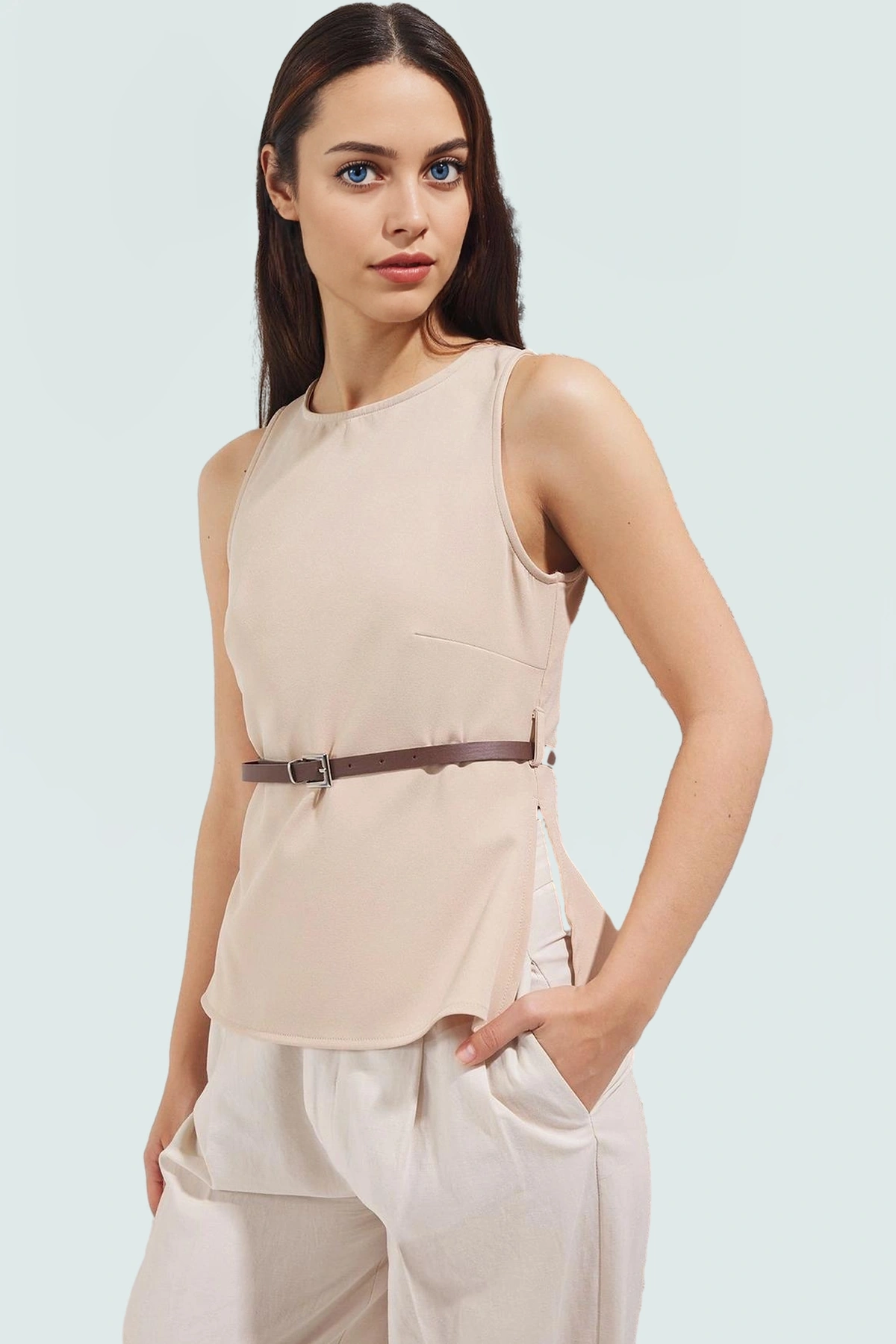 Yaz aylarının sıcak günlerinde serin ve şık kalmak için ideal bir seçenek olan bej renkli kolsuz bluzumuz, dokuma kumaşının nefes alabilir yapısıyla konforu ön planda tutuyor. Slim fit kalıbı ve bisiklet yakasıyla vücut hatlarınızı zarifçe ortaya koyarken, günlük yaşamın rahatlığını da sunuyor. Üzerinde taşıdığınız rahatlığı ve şıklığı hissetmenizi sağlar. Bu bluz ile kendinizi özgüvenli ve güzel hissedeceksiniz.