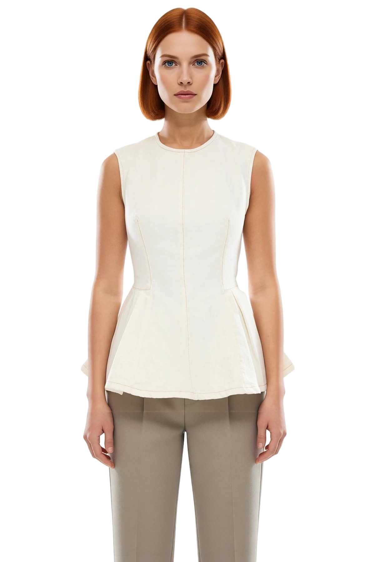 Bu sezonun trendlerinden biri olan kolsuz ekru denim bluzumuz, gardırobunuzun yeni favorisi olacak. Rahatlığı ve şıklığı bir arada sunan tasarımı ile günlük yaşamınızda rahatlıkla kullanabileceğiniz gibi, özel günlerinizde de stilinizi ön plana çıkarabilirsiniz. Nefes alan, yumuşak dokusuyla gün boyu konforlu bir kullanım sunan %100 pamuk denim kumaştan üretilmiştir. Bisiklet yakası ve fitted kalıbı ile vücut hatlarınızı zarifçe vurgulayan bluz, etek kısmındaki fırfır detayları ile feminen bir görünüm kazandırıyor.