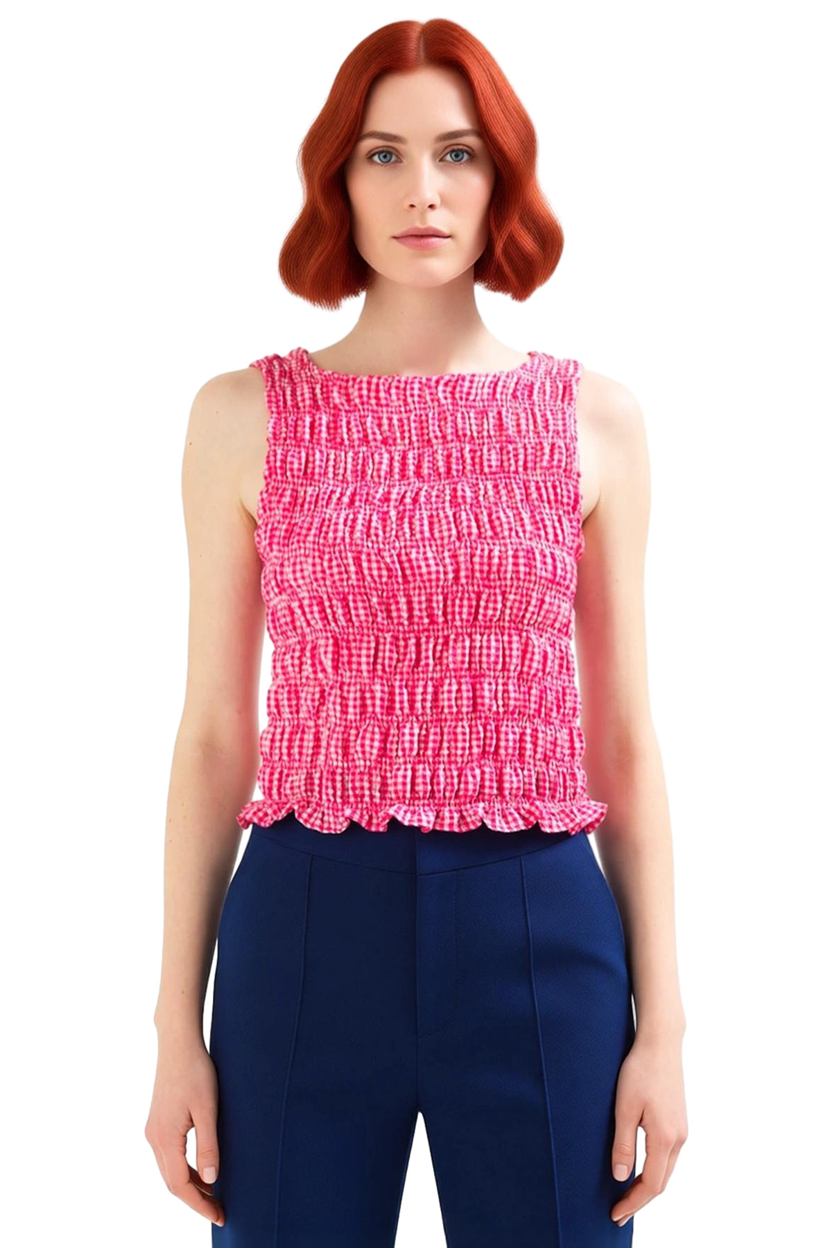 Bu sezonun en trend parçası olan pembe ekose bluzümüz, benzersiz tasarımı ve rahatlığıyla dikkat çekiyor. Nefes alan dokuma kumaştan üretilen bluz, gün boyu konforlu bir kullanım sunuyor. Fitted kalıbı sayesinde vücut hatlarınızı zarifçe ortaya koyan bluz, kolsuz tasarımıyla sıcak yaz günlerinde ideal bir seçim. Kayık yakası, şık ve modern bir görünüm sağlarken, ekose deseniyle de tarzınıza farklılık katıyor. %69 polyester, %29 pamuk ve %2 elastan karışımı olan kumaşı, dayanıklı ve kolay bakımıyla öne çıkıyor. Makinede yıkanabilir özelliğiyle pratik kullanım sunuyor.