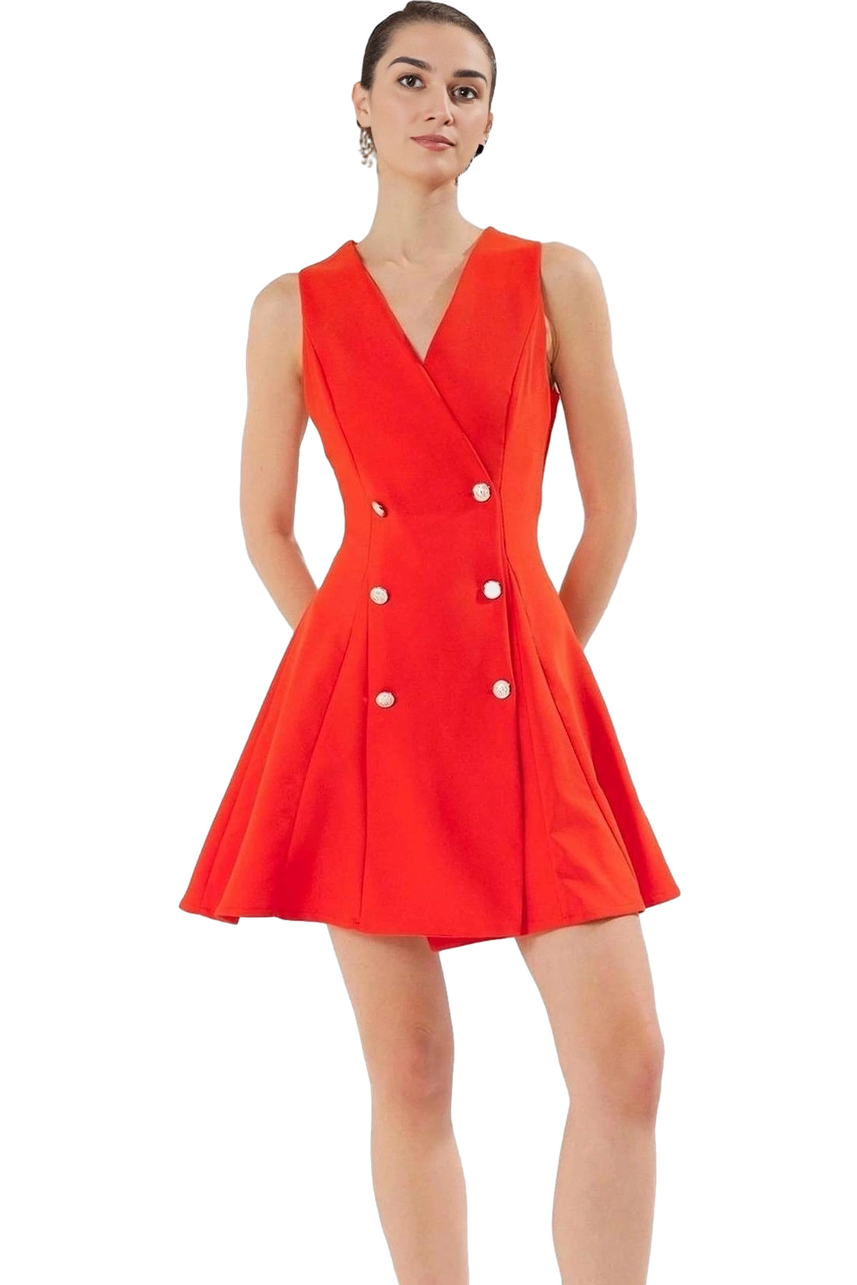 88% polyester ve 12% elastan karışımından üretilen bu finike dokuma elbise, dayanıklılığı ve kolay bakımıyla öne çıkıyor. Kolsuz tasarımı ve mini boyuyla sıcak yaz günlerinde serin kalmanıza yardımcı olurken, ceket elbise siluetiyle de şık bir görünüm elde etmenizi sağlıyor. V yakası ve ince detaylarıyla zarif bir duruş sergilerken, şık düğmeleri de elbiseye modern bir hava katıyor. Rahat ve şık bir görünüm elde etmek için ideal olan bu elbise, gün boyu mükemmel hissetmenizi sağlayacak.