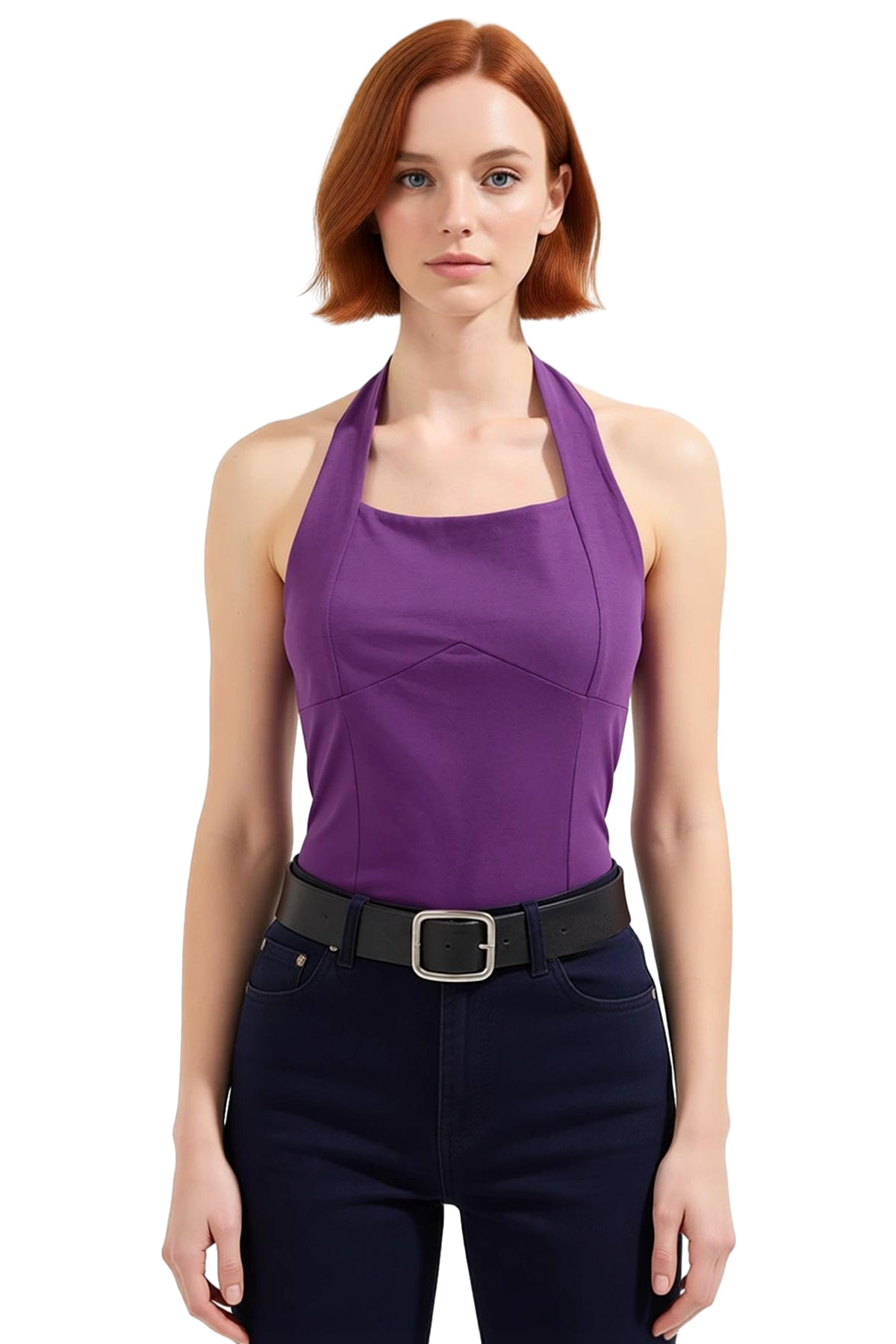 Rahatlığı ve şıklığı birleştiren, boyundan bağlamalı kolsuz mor bluz ile tanışın! Bu bluz, yaz aylarının vazgeçilmezi olacak. 96% pamuk ve %4 elastan karışımından oluşan likralı penye süprem kumaş, nefes alabilirliği ve yumuşak dokusuyla gün boyu konfor sunar. Fitted kalıbı, vücuda mükemmel oturur ve zarif bir görünüm sağlar. Basic silüetiyle her tarza uyum sağlar; günlük hayatta jean pantolon ve spor ayakkabılarla, akşamları ise etek ve şık ayakkabılarla kombinleyebilirsiniz. Boyundan bağlamalı yaka detayı, bluza feminen bir hava katar. Kolsuz tasarımı, sıcak günlerde serin kalmanızı sağlar.