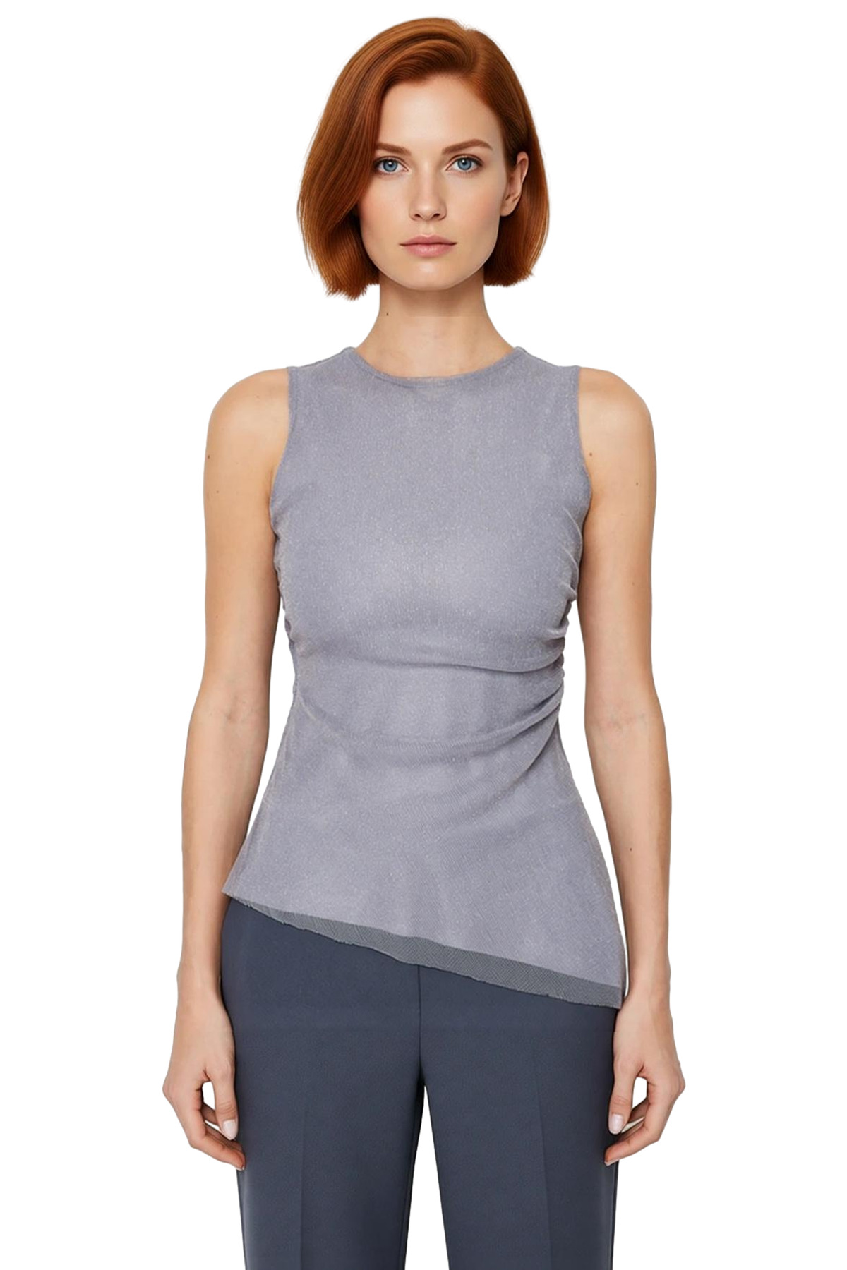 Rahatlığı ve şıklığı bir arada arayanlar için ideal bir seçenek olan gri örme bluz, gardırobunuzun yeni favorisi olacak. Hafif ve nefes alan tül kumaştan üretilen bu kolsuz bluz, yaz aylarında serin ve rahat kalmanıza yardımcı olacak. Kayık yakası ve regular kalıbıyla her vücut tipine uyum sağlar. Büzgü detayı bluza hareketli bir görünüm kazandırırken, asimetrik silüeti modern ve şık bir tarz sunar. Günlük kombinlerinizde rahatlıkla kullanabileceğiniz bu bluz, her ortama uyum sağlayacak.