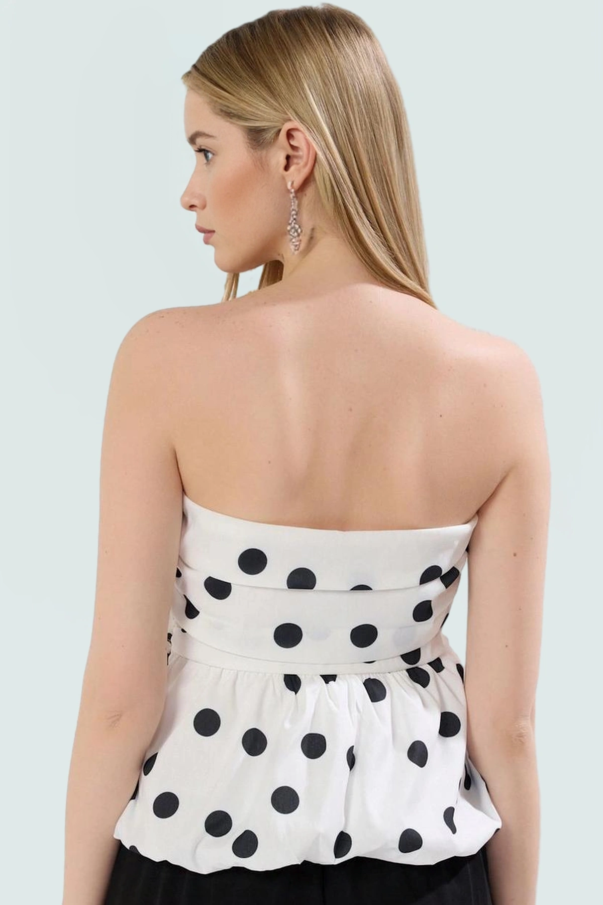Yumuşak ve nefes alabilen Terrycotton kumaş, yaz sıcağında serin kalmanıza yardımcı olurken, %96 polyester ve %4 elastan içeriğiyle dayanıklı ve uzun ömürlü kullanım sunuyor. Straplez yaka, omuzlarınızı zarif bir şekilde ortaya çıkararak tarzınıza sofistike bir dokunuş katarken, puantiyeli desen ise şıklığınıza hareketlilik getiriyor. Kolayca makinede yıkanabilen bu bluz, pratik kullanım sağlar.